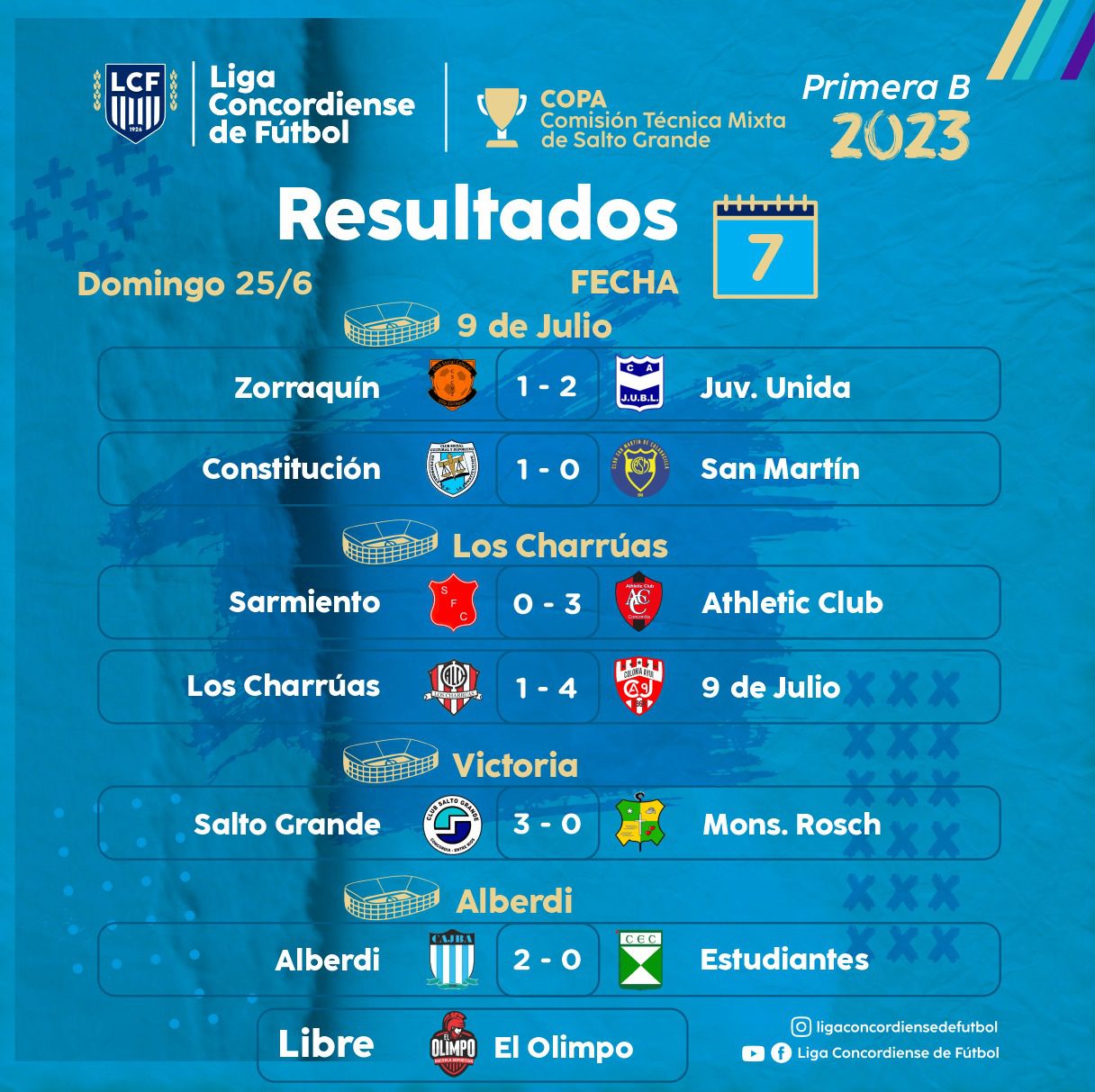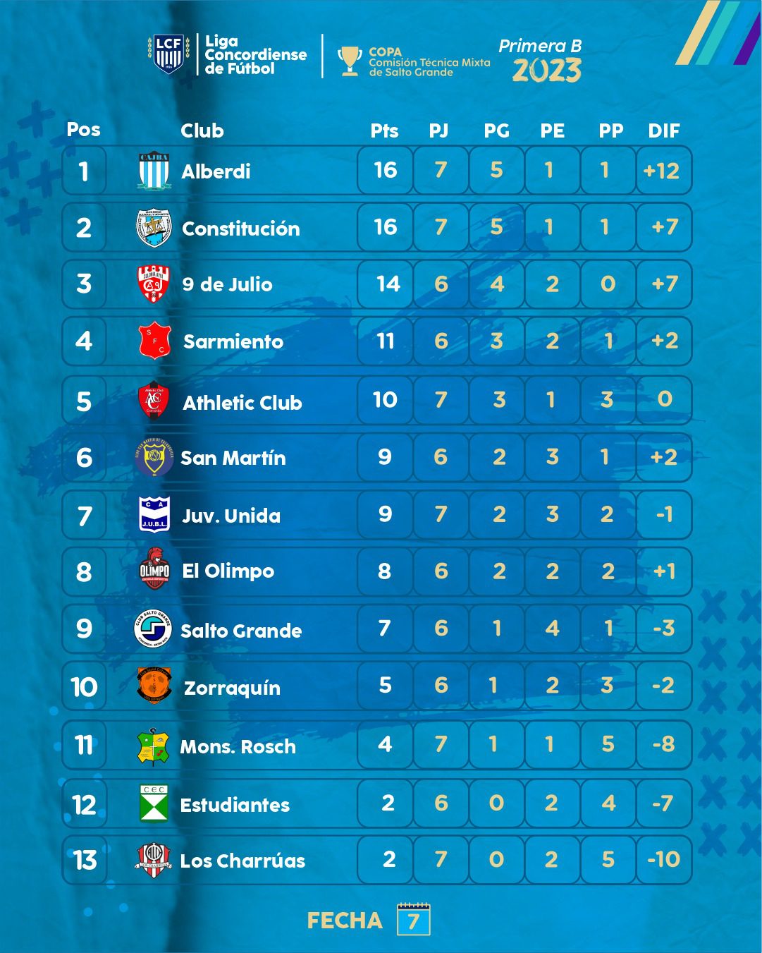 El que no le pierde pisada a los líderes es 9 de Julio que derrotó 4 a 1 a Atlético Charruas como visitante. El «nueve» tiene un partido menos que Alberdi y Constitución y ahora quedó como único invicto en la «B». El dueño de casa acumuló la quinta derrota y junto a Estudiantes están últimos con apenas dos unidades.