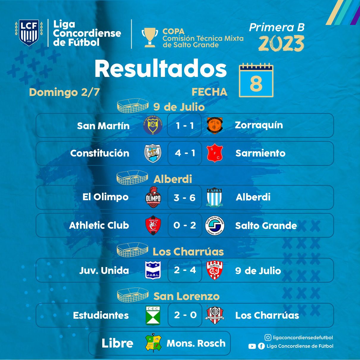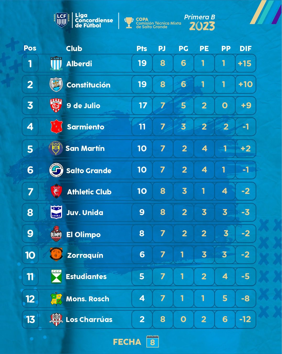 Se jugó la octava fecha de la Primera «B» Copa Comisión Técnica Mixta de Salto Grande. En La Criolla, Juan Bautista Alberdi derrotó 6 a 3 a El Olimpo mientras que en el Juan Carbonara, Defensores de La Constitución venció 4 a 1 a Sarmiento. Tanto el «celeste» como «conti» lideran la tabla aunque 9 de Julio que doblegó 4 a 2 a Juventud Unida esta segundo a dos unidades y con un partido menos. La pelea por el ascenso está apasionante. También, Salto Grande le ganó 2 a 0 a Athletic Club y de a poco va recuperando terreno. Estudiantes obtuvo su primera victoria de la temporada al vencer 2 a 0 a Atlético Charrúas mientras que San Martín y Villa Zorraquín igualaron 1 a 1.