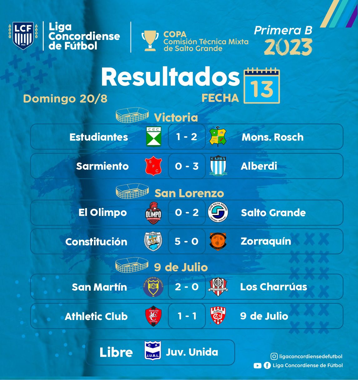 Se jugó la última fecha de la Primera «B» Copa Comisión Técnica Mixta de Salto Grande. Juan Bautista Alberdi derrotó 3 a 0 a Sarmiento y se consagró campeón. De esta manera, el «celeste» vuelve rápidamente a la primera División del Fútbol concordiense y se clasificó para la Copa Entre Ríos. Por su parte, Defensores de la Constitución goleó 5 a 0 a Villa Zorraquín y 9 de Julio igualó 1 a 1 con Athletic Club. En los otros resultados, San Martín doblegó 2 a 0 a Atlético Los Charrúas, Salto Grande también le ganó 2 a 0 a El Olimpo y Monseñor Rosch se impuso por 2 a 1 a Estudiantes.