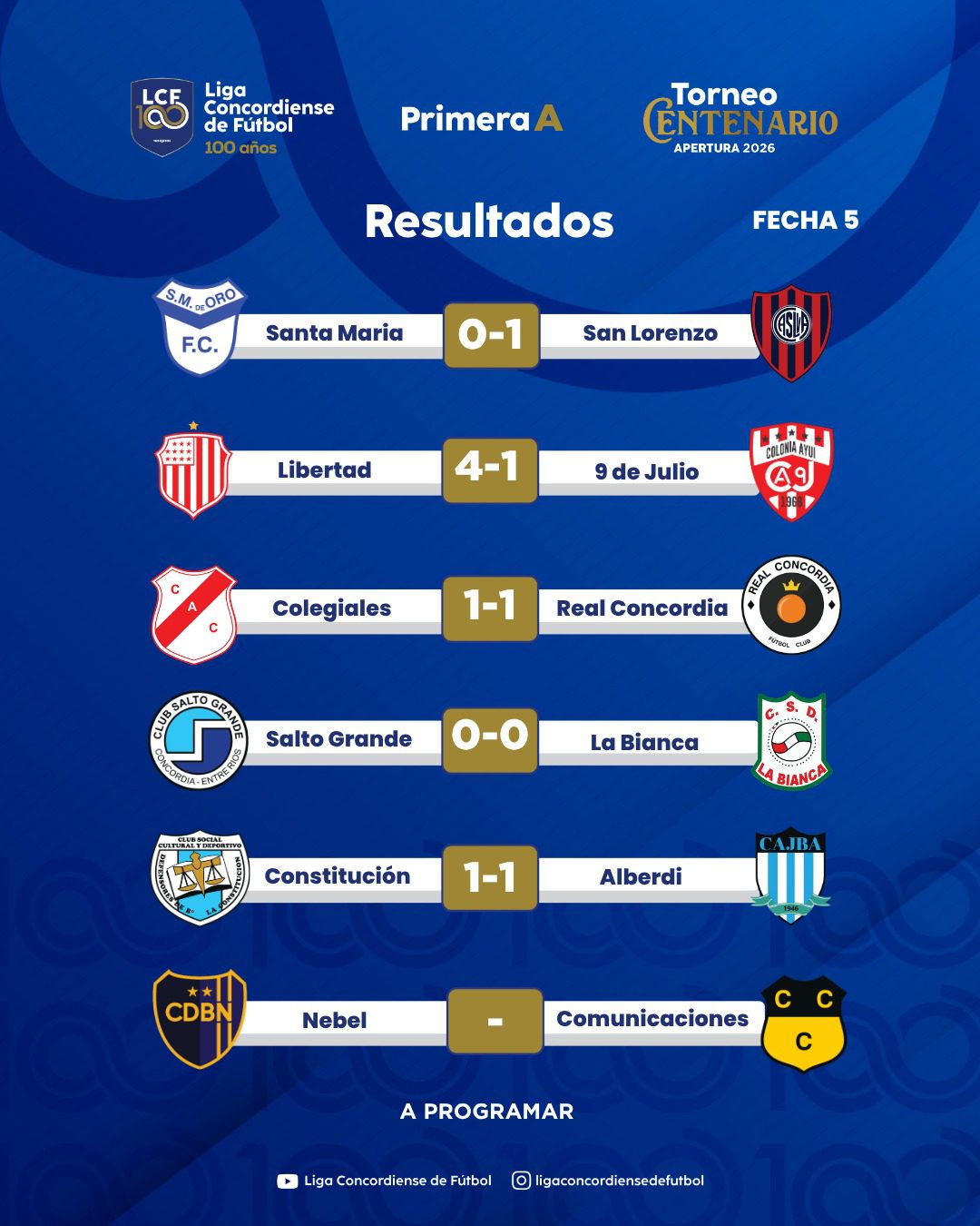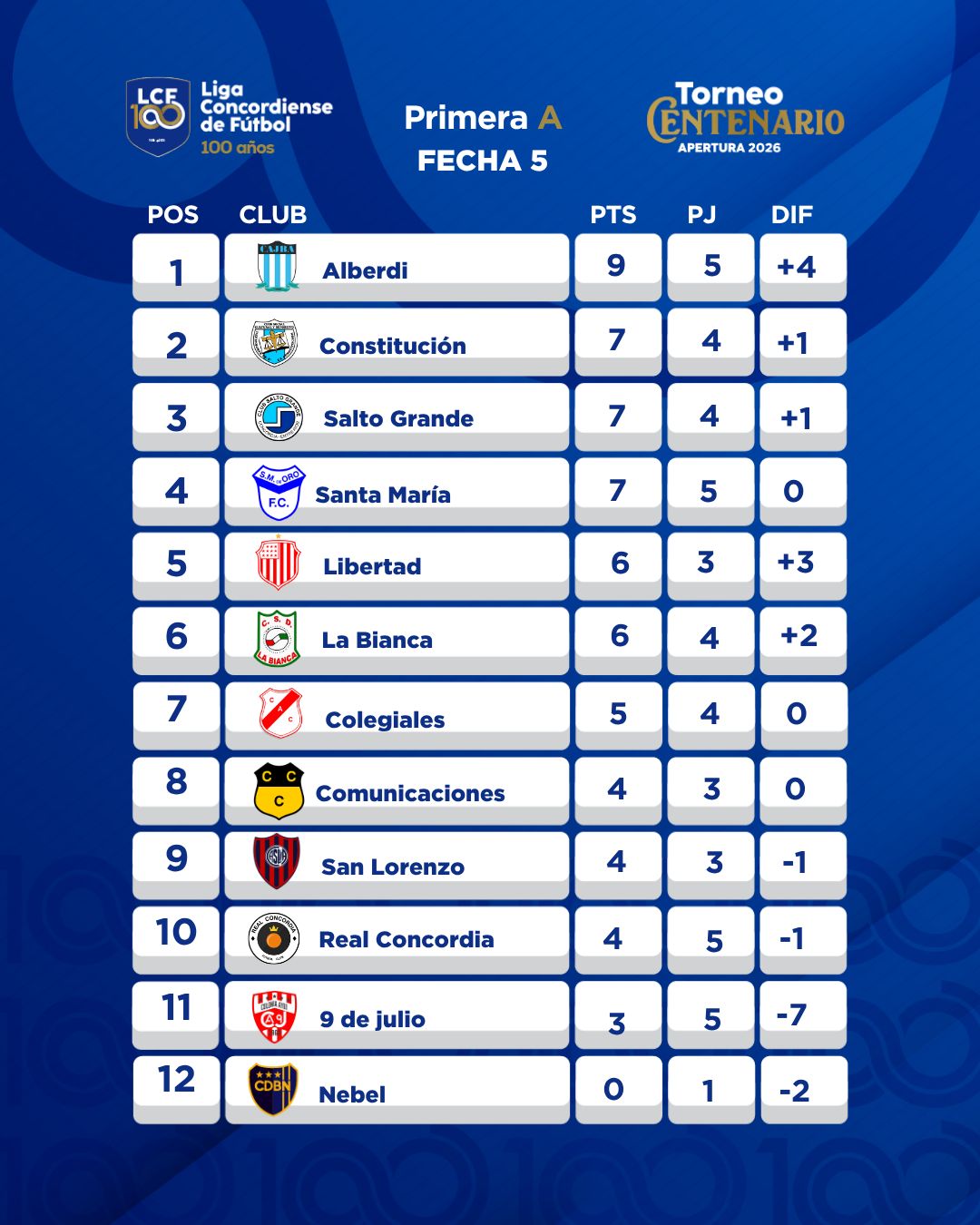 Se disputaron cinco encuentros de la quinta fecha del Torneo Centenario Apertura de la Primera A. Alberdi igualó 1 a 1 ante Constitución y sigue siendo el líder. Previamente La Bianca y Salto Grande no se sacaron ventajas y terminaron 0 a 0. Libertad derrotó 4 a 1 a 9 de Julio, San Lorenzo le ganó 1 a 0 a Santa María de Oro y Colegiales empató 1 a 1 ante Real.