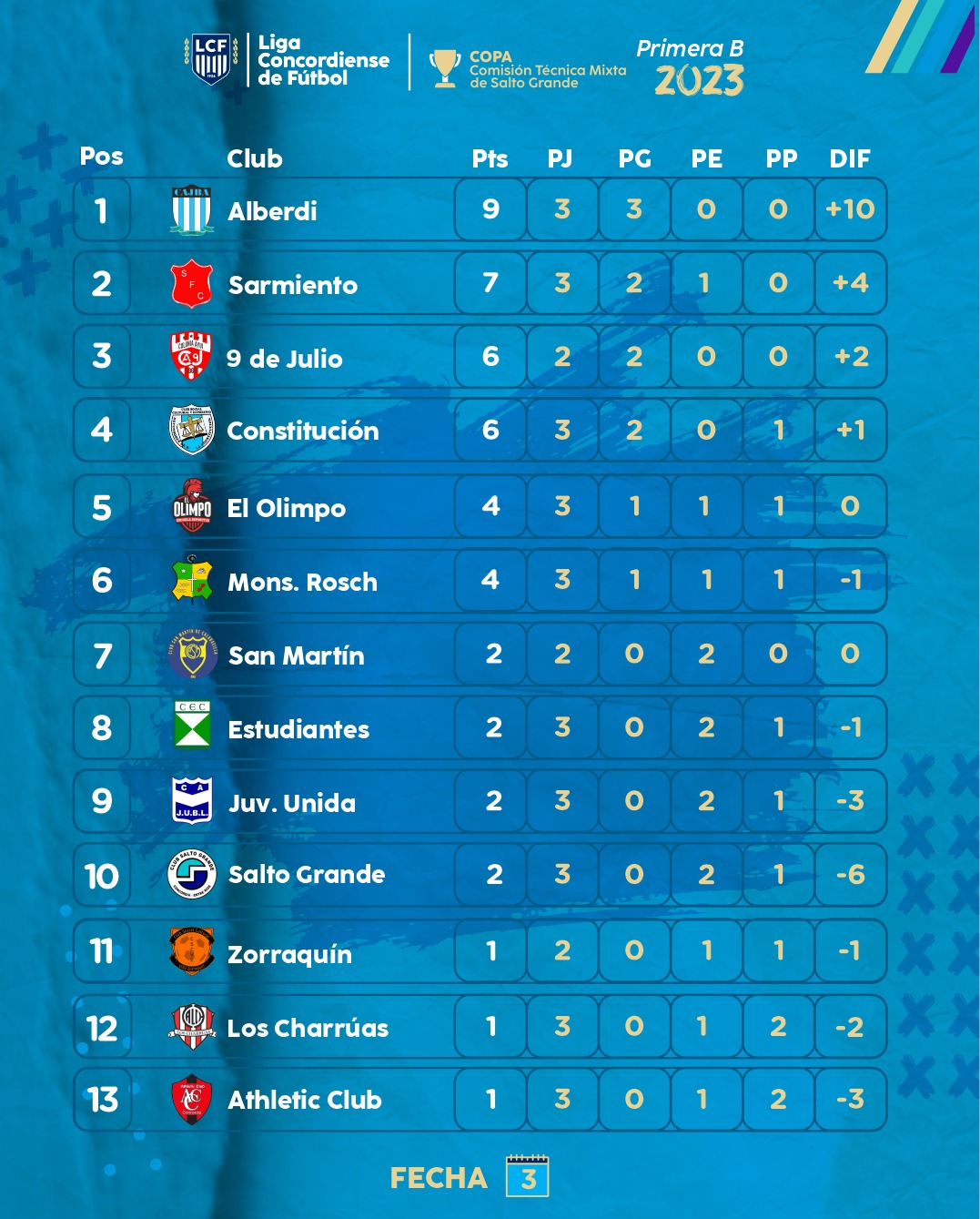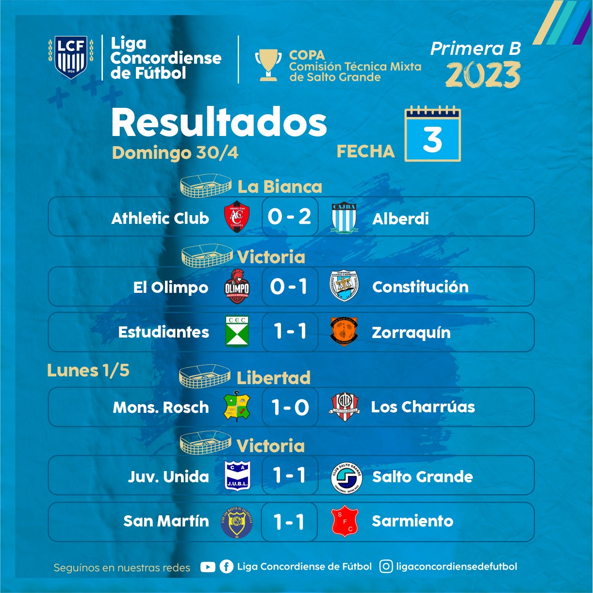 Se jugó la tercera fecha de la Primera «B» Copa Comisión Técnica Mixta de Salto Grande. Alberdi le ganó 2 a 0 a Athletic Club y quedó cómo único líder del certamen. Sarmiento igualó 1 a 1 con San Martín de Calabacillas. Defensores de La Constitución volvió a ganar sobre la hora, esta vez fue 1 a 0 ante El Olimpo. Estudiantes y Club Social y Cultural Villa Zorraquín también empataron 1 a 1 al igual que Juventud Unida ante Salto Grande. Por último Monseñor Rosch consiguió su primer victoria de la temporada al vencer 1 a 0 a Atlético Los Charrúas. 9 de Julio de Colonia Ayuí tuvo jornada libre.
