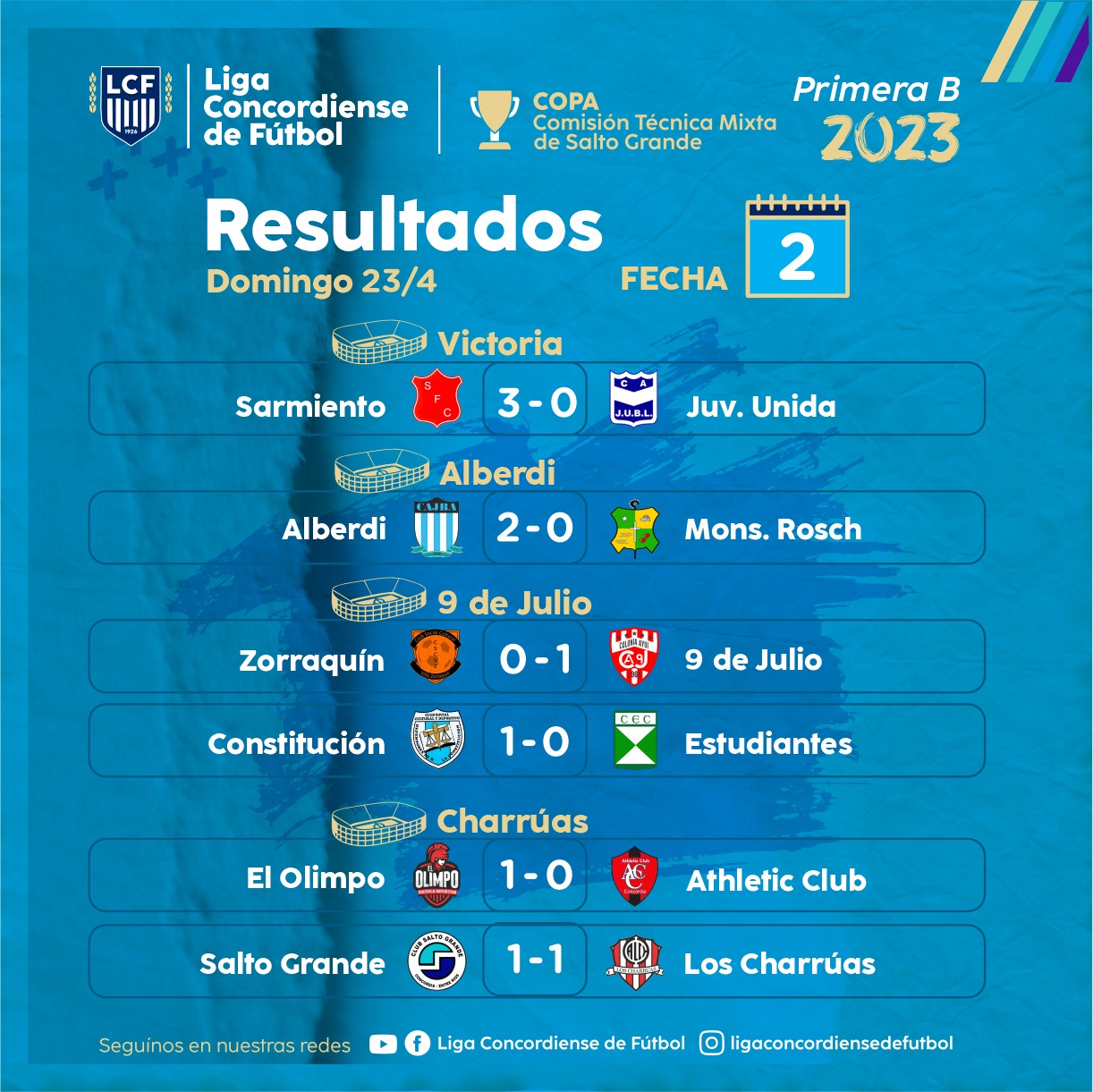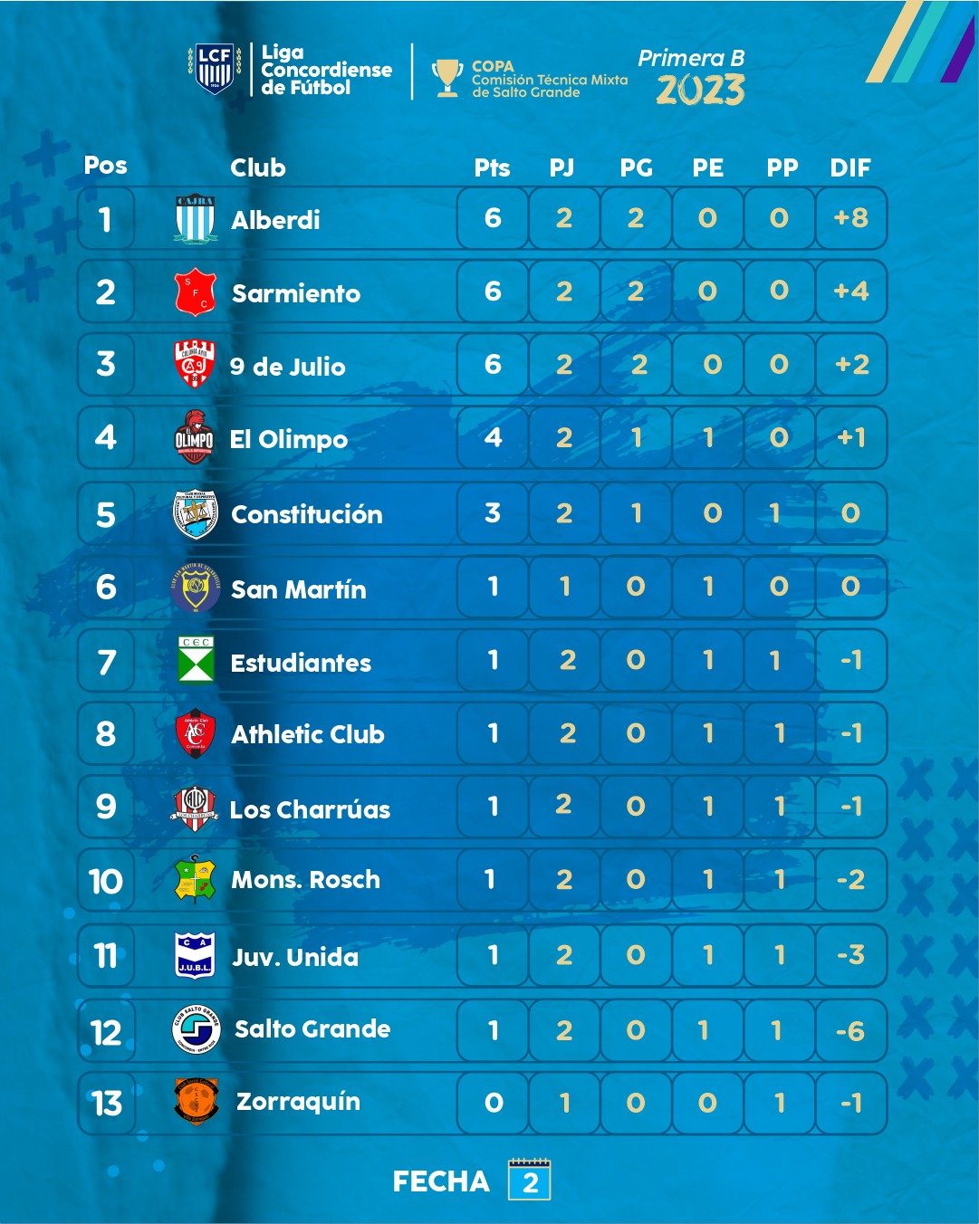 Se jugó la segunda fecha de la Primera B «Copa Comisión Técnica Mixta de Salto Grande». Sarmiento que venció con autoridad por 3 a 0 a Juventud Unida en la cancha de Victoria, Alberdi que doblegó 2 a 0 a Monseñor Rosch en La Criolla y 9 de Julio que le ganó sobre el cierre 1 a 0 a Zorraquín en Colonia Ayuí lideran en la categoría ascenso. También en el Juan Carbonara, Defensores de La Constitución a minutos del final batió por 1 a 0 a Estudiantes mientras que en Charrúas, El Olimpo ganó el choque de debutantes por 1 a 0 a Athletic Club y Salto Grande igualó 1 a 1 ante Atlético. El bicho, el celeste y el nueve son los tres conjuntos que mantuvieron el puntaje ideal.