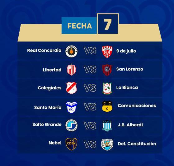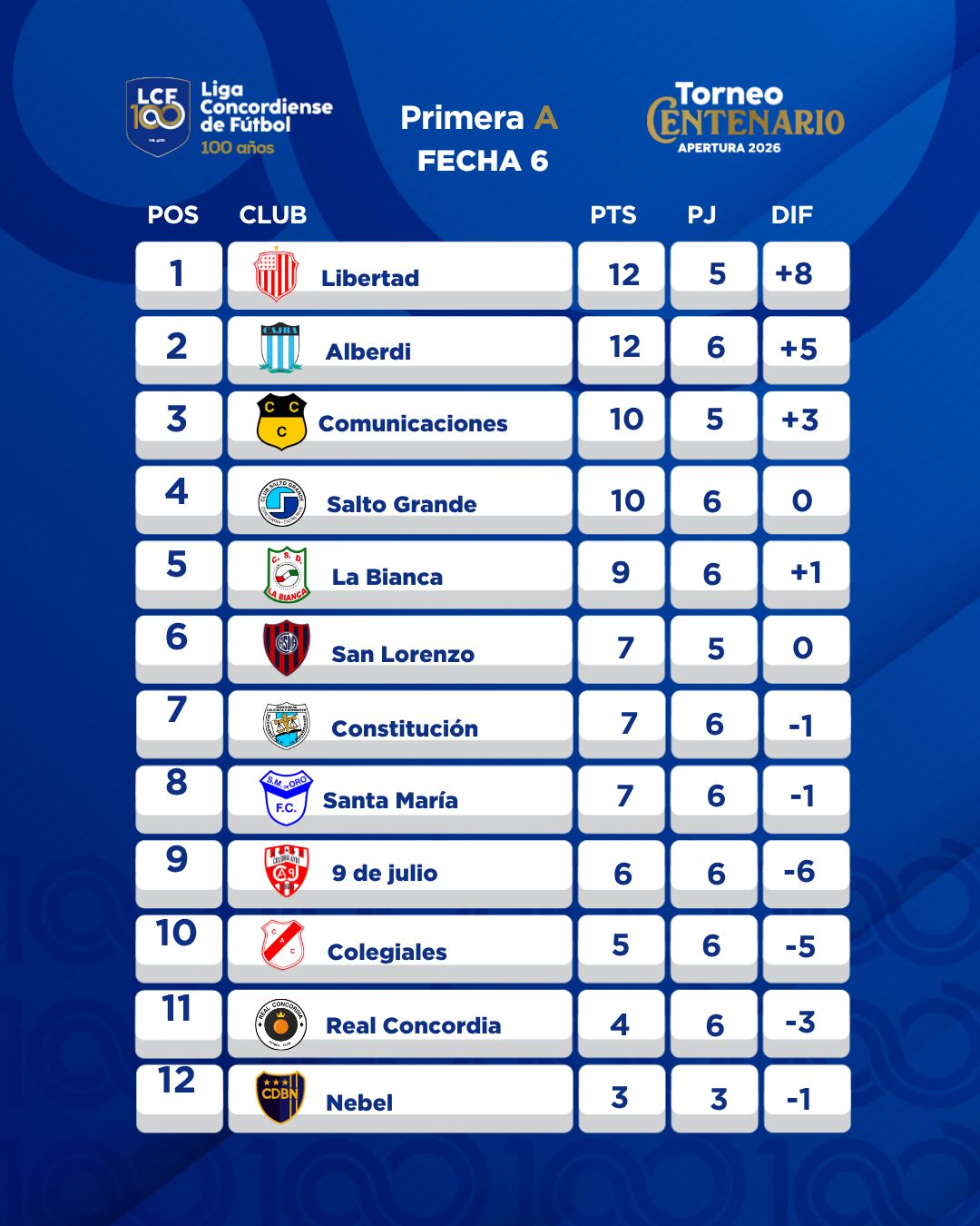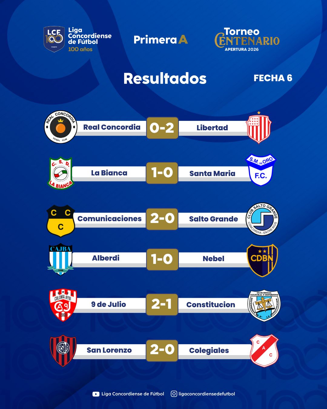 Se jugó la sexta fecha del Torneo Centenario Apertura. Libertad que doblegó 2 a 0 a Real y Alberdi que le ganó agónicamente a Nebel 1 a 0 son los líderes de la competencia pasando la mitad del torneo. Además, La Bianca venció 1 a 0 a Santa María de Oro, Comunicaciones batió 2 a 0 a Salto Grande, San Lorenzo derrotó 2 a 0 a Colegiales y 9 de Julio de impuso por 2 a 1 ante Constitución.
