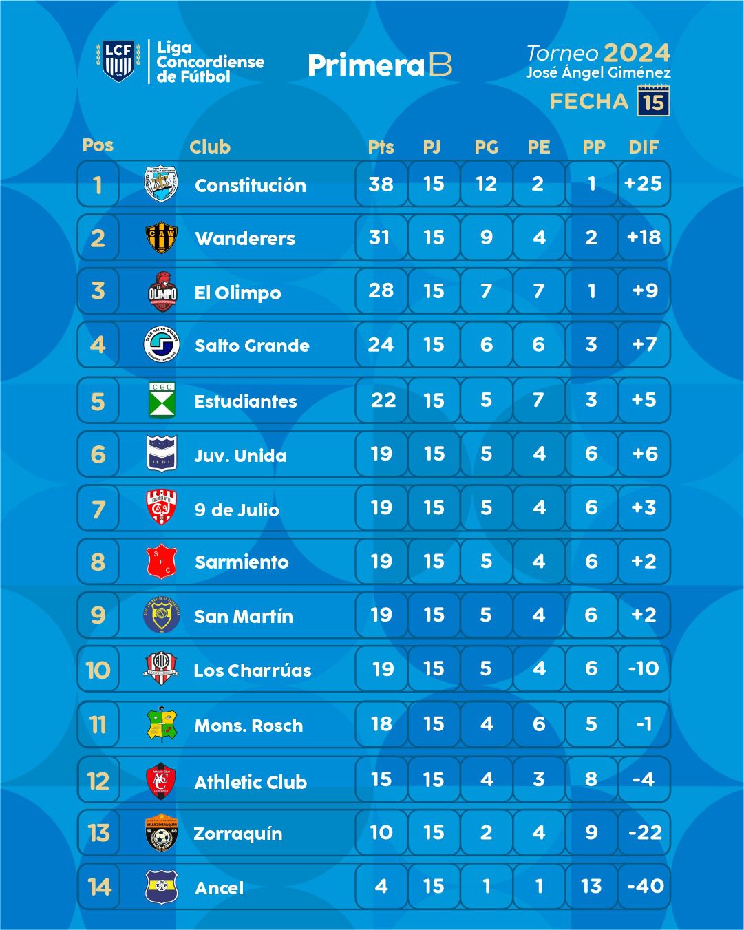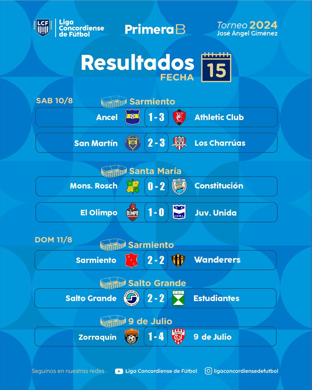 Se disputó la decimoquinta fecha de la Primera «B» José Ángel Giménez. Constitución doblegó a Monseñor Rösch por 2 a 0 y le sacó siete puntos de diferencia a Wanderer’s que igualó 2 a 2 ante Sarmiento. El Olimpo le ganó 1 a 0 a Juventud Unida. También empataron 2 a 2 Salto Grande y Estudiantes. Los Charrúas venció 3 a 2 a San Martín y Athletic Club se impuso por 3 a 1 ante Ancel. Por último 9 de Julio batió 4 a 1 a Villa Zorraquín.