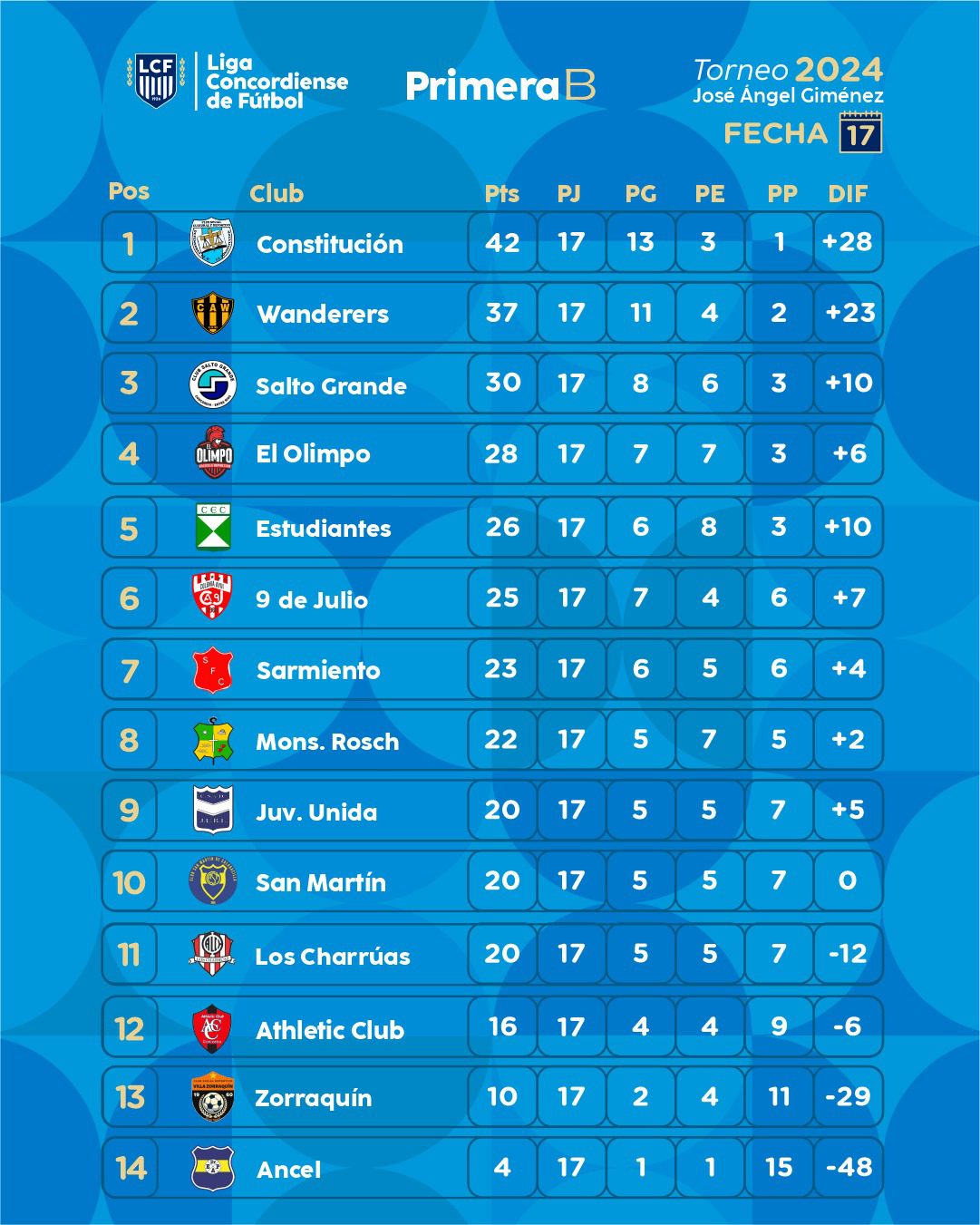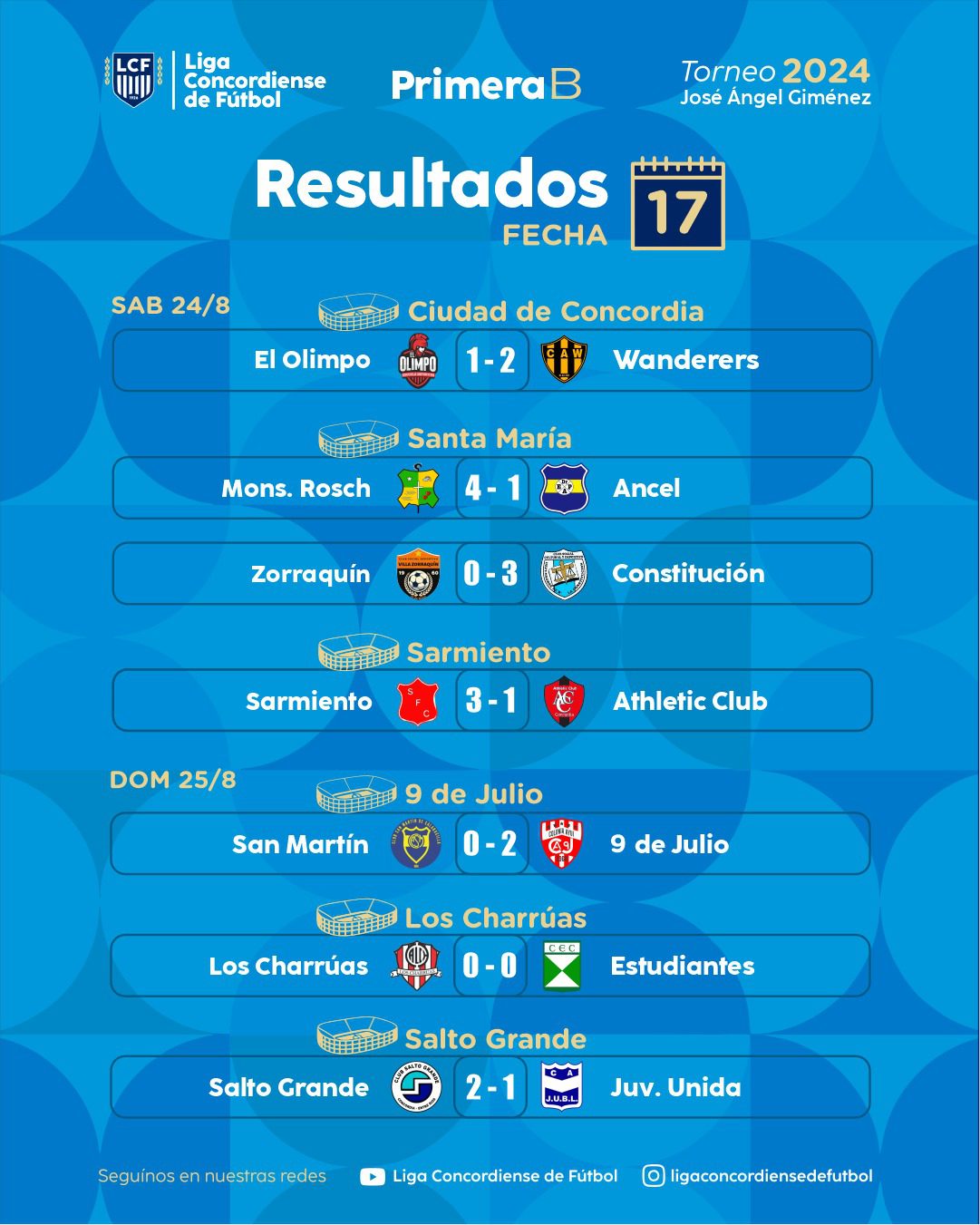Se jugó la decimoséptima fecha de la Primera «B» José Ángel Giménez. Constitución venció 3 a 0 a Villa Zorraquín y continúa liderando el certamen llevándole cinco unidades a Wanderer´s que sobre la hora derrotó 2 a 1 a El Olimpo. Salto Grande trepó al tercer lugar al imponerse por 2 a 1 a Juventud Unida. Atlético Charrúas y Estudiantes no se sacaron ventajas. 9 de Julio sigue escalando y ahora doblegó 2 a 0 a San Martín. Sarmiento le ganó 3 a 1 a Athletic y Monseñor Rosch batió 4 a 1 a Ancel.