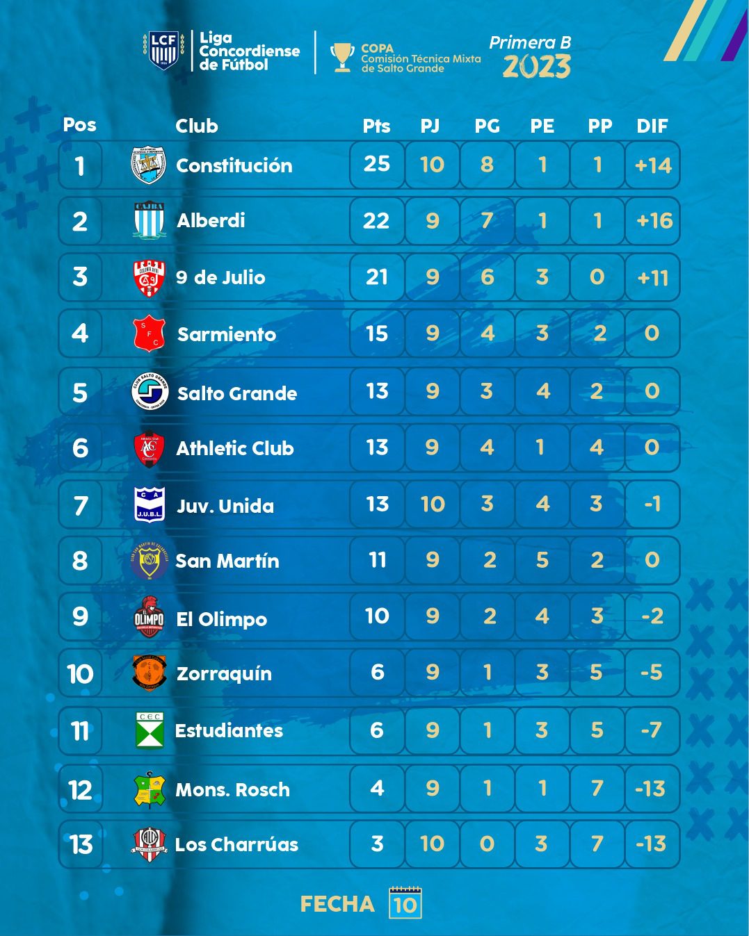 Se jugó la décima fecha de la Primera «B» Copa Comisión Técnica Mixta de Salto Grande. Defensores de La Constitución venció con autoridad por 4 a 1 a Monseñor Rosch y mantuvo la punta. Juan Bautista Alberdi en un clásico zonal le ganó 2 a 1 a Atlético Los Charrúas y no le pierde pisada. El que resignó unidades fue 9 de Julio que igualó 1 a 1 ante Sarmiento. Salto Grande doblegó por 2 a 0 a Villa Zorraquín, San Martín empató 1 a 1 con Estudiantes y El Olimpo y Juventud Unida no se sacaron ventajas y terminaron 0 a 0.