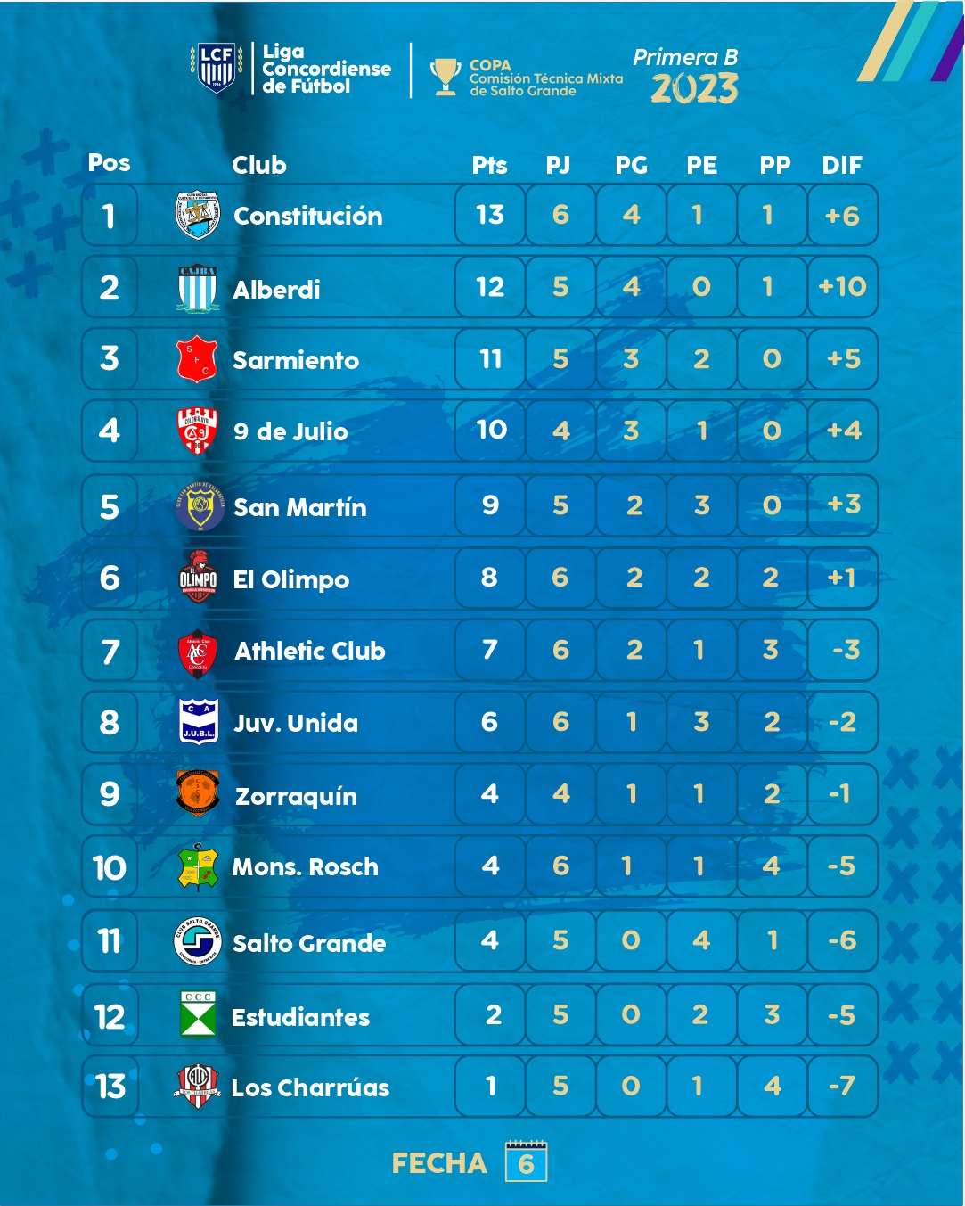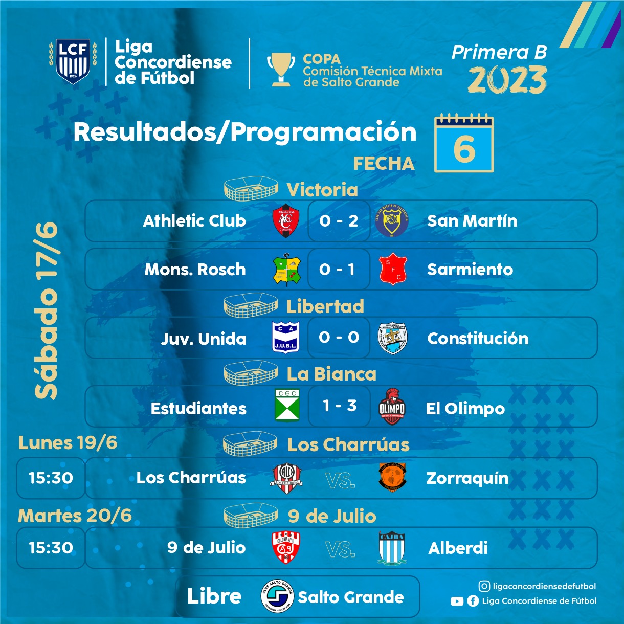 Se disputaron cuatro encuentros correspondientes a la sexta fecha de la Primera «B» Copa Comisión Técnica Mixta de Salto Grande. Defensores de La Constitución igualó 0 a 0 ante Juventud Unida. Sarmiento volvió al triunfo al vencer por 1 a 0 a Monseñor Rosch. San Martín de Calabacilla doblegó 2 a 0 a Athletic Club y El Olimpo se impuso por 3 a 1 a Estudiantes. La fecha se completará con el compromiso del lunes entre Atlético Charrúas y Zorraquín y el clásico entre 9 de Julio y Juan Bautista Alberdi que se enfrentarán el martes en Colonia Ayuí.
