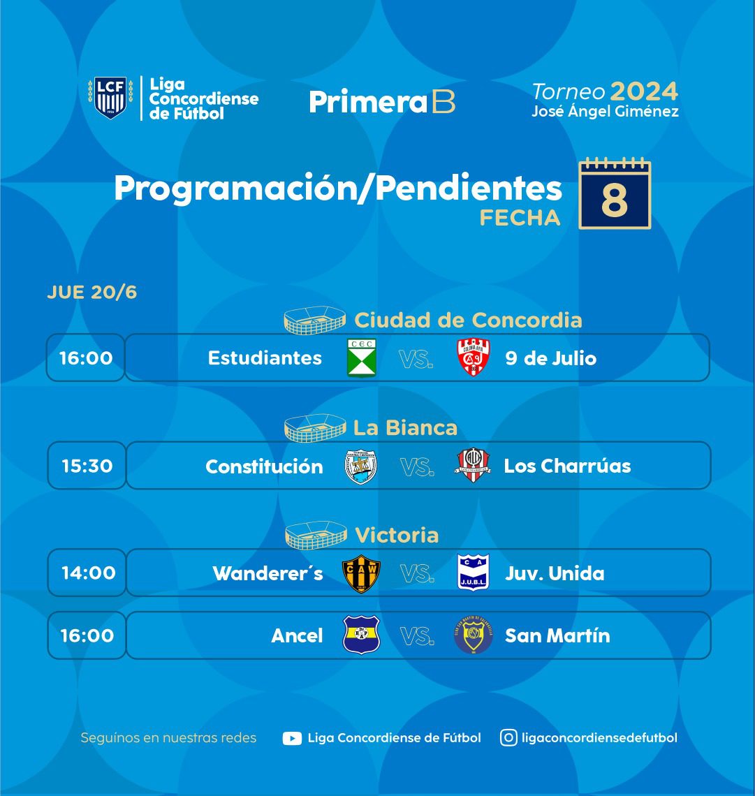 La Liga Concordiense programó los encuentros pendientes tanto de la Primera «A» como de la Primera «B» que se disputarán este jueves 20 de junio aprovechando el feriado del Dia de la Bandera.