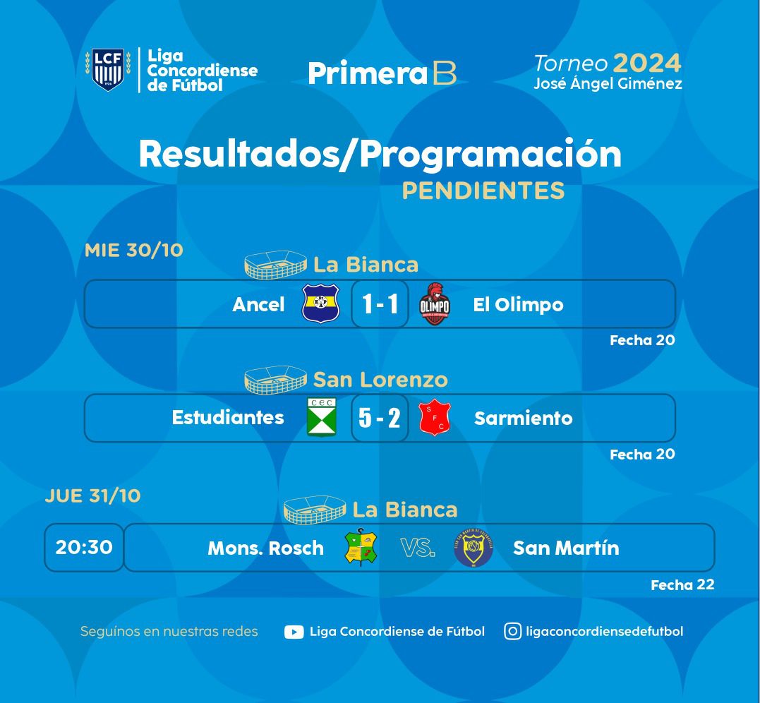 El miércoles por la noche se jugaron dos cotejos pendientes válidos por la vigésima fecha de la Primera «B» José Ángel Giménez. Estudiantes derrotó 5 a 2 a Sarmiento en Villa Adela y se aseguró el pase al Petit Torneo. Mientras tanto en La Bianca, Ancel y El Olimpo igualaron 1 a 1. Este jueves también en la cancha del «tricolor» se enfrentarán Monseñor Rosch y San Martín a las 20.30 horas.