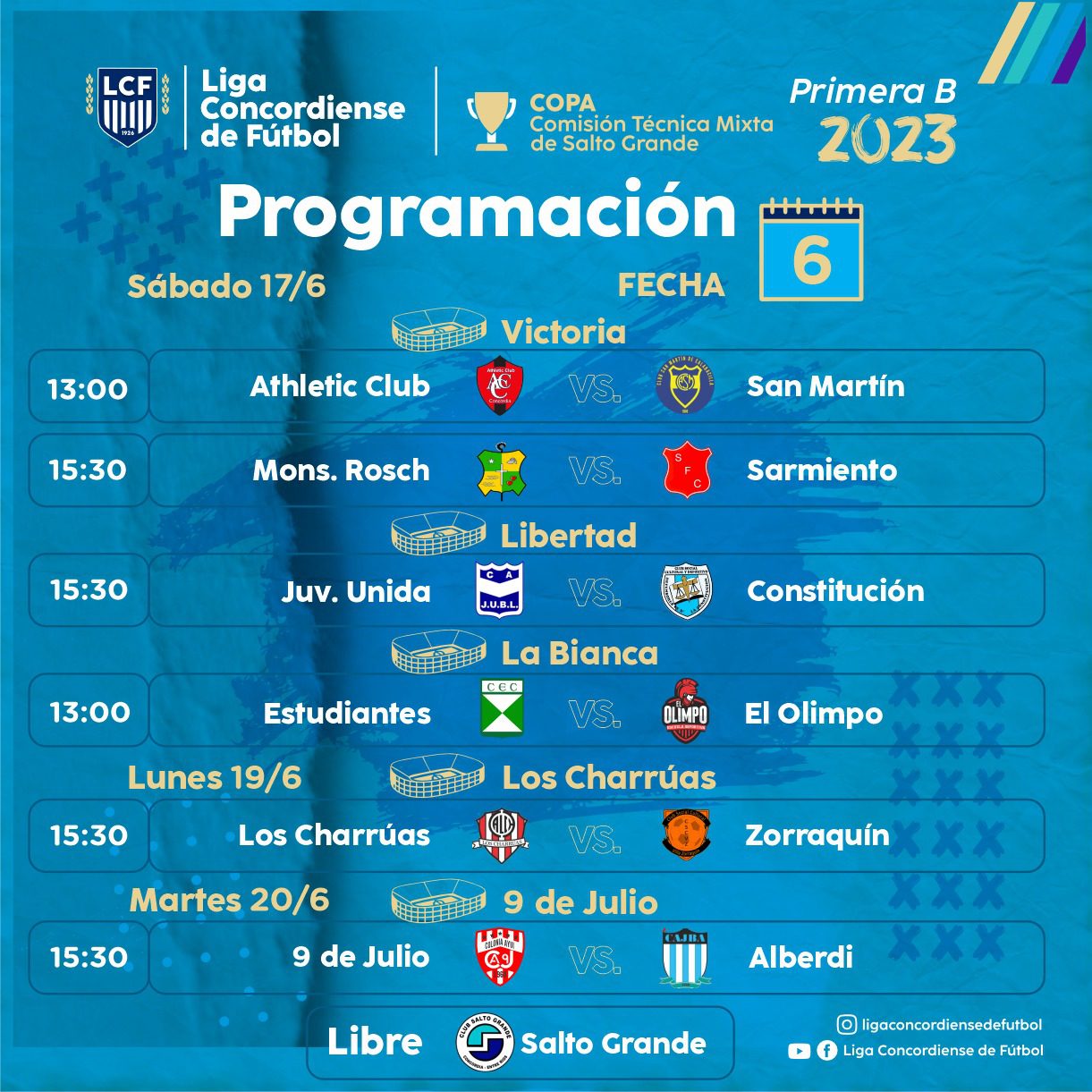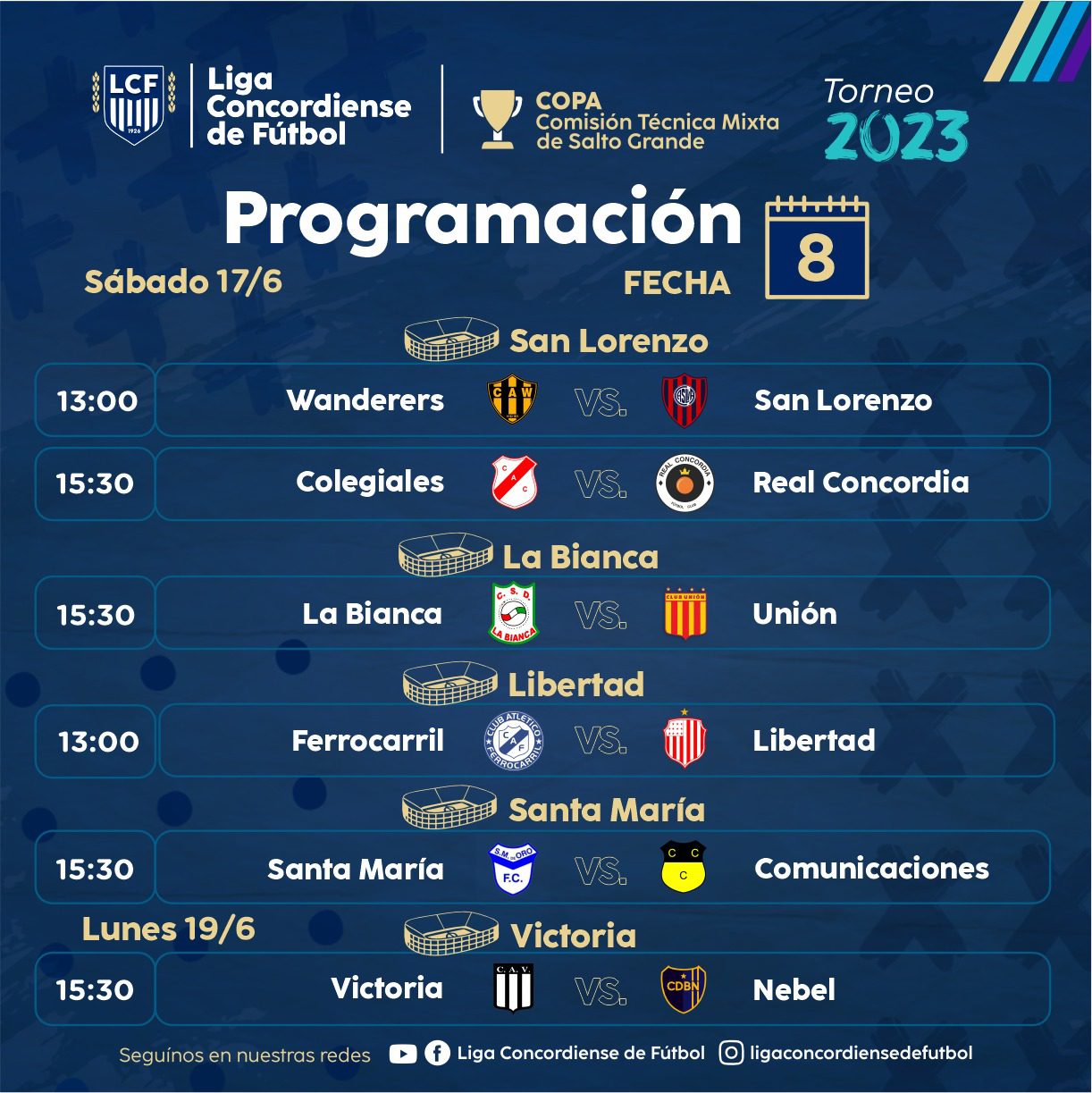 La Liga Concordiense de Fútbol tras una nueva reunión con Presidentes y delegados, dio a conocer la programación para la octava fecha de la Primera «A» y la sexta de la Primera «B». La mayor parte de los encuentros de la Divisional mayor se disputarán el sábado miéntras que el lunes se completará con el compromiso entre Victoria y Nebel. En el ascenso se jugará el clásico entre 9 de Julio y Juan Bautista Alberdi el martes en Colonia Ayuí.