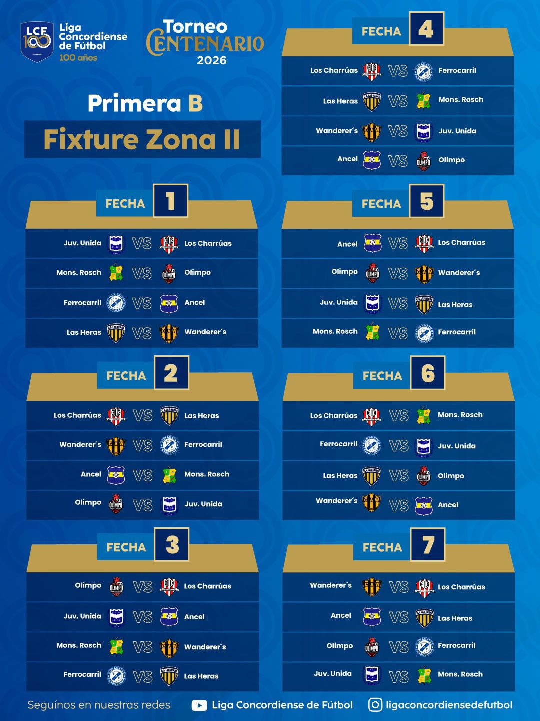 La Liga Concordiense de Fútbol da a conocer el fixture para la Divisional «B» 2026 «Torneo Centenario» que en esta edición tendrá dos zonas de 8 equipos. El primero de cada grupo jugará la Final por el ascenso a la Primera «A». Recordamos que el perdedor del cotejo decisivo esperará al ganador del Petit Torneo que lo disputarán el segundo y el tercero de cada zona por un lugar en la Promoción contra el penúltimo de la tabla anual de la divisional mayor.