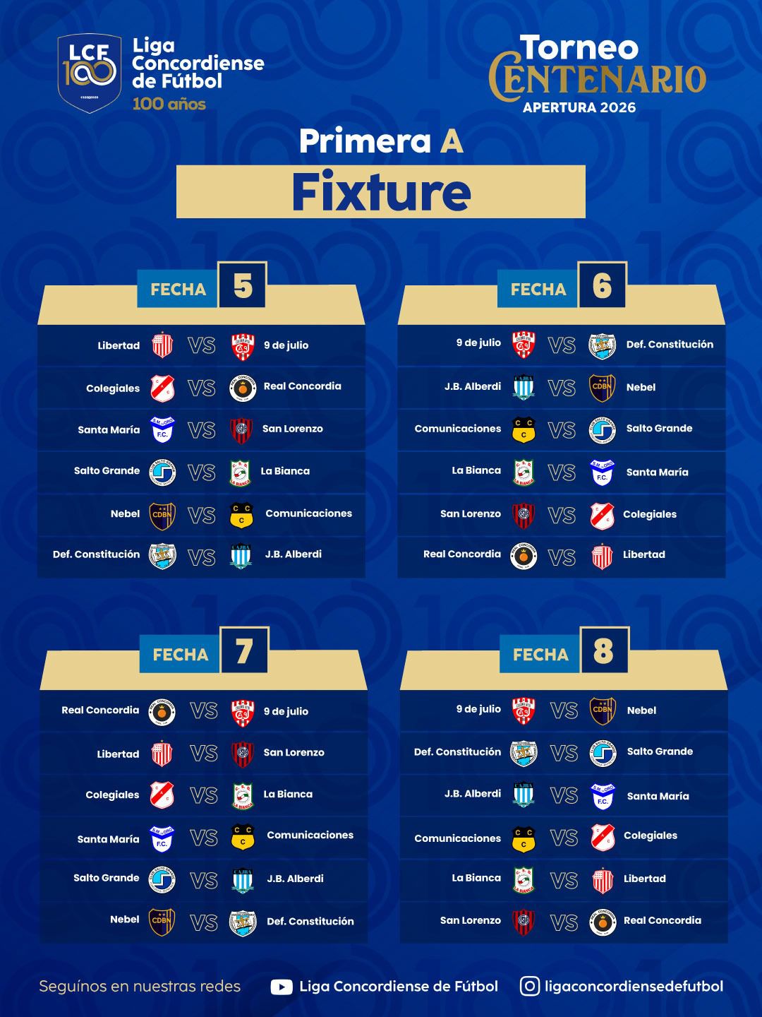 La Liga Concordiense de Fútbol informa el fixture del «Torneo Centenario» Apertura 2026 de la Primera «A»