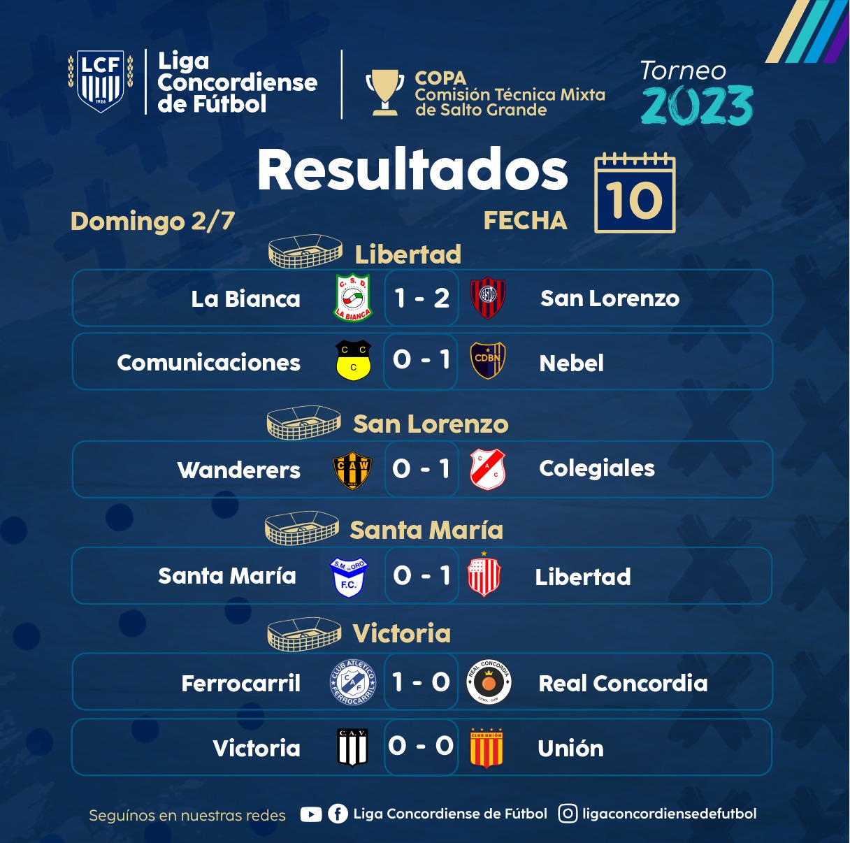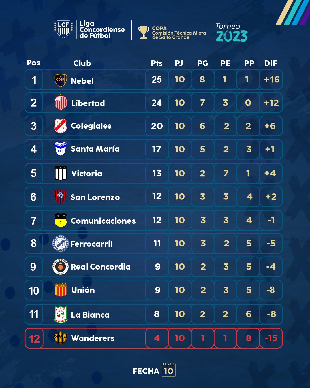 Se jugó la décima y penúltima fecha de la Primera «A» Copa Comisión Técnica Mixta de Salto Grande. Defensores de Nebel derrotó 1 a 0 a Comunicaciones y sostuvo la punta. Libertad le ganó sobre la hora a Santa María de Oro y la lucha por el título se definirá en la última jornada. Colegiales se aseguró el ingreso al Petit al triunfar por 1 a 0 ante Wanderer´s. El «bohemio» ya no podrá salir de la última posición y descendió a la Primera «B». San Lorenzo venció 2 a 1 a La Bianca y aún conserva las chances matemáticas de meterse en el reducido. Ferro consiguió una buena victoria al ganarle 1 a 0 a Real Concordia mientras que Victoria y Unión no se sacaron ventajas y culminaron 0 a 0.