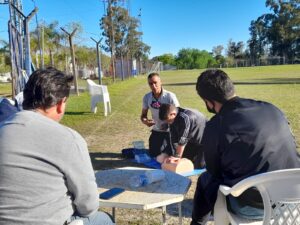 Las capacitaciones sobre primeros auxilios estuvieron en esta oportunidad en la cancha del Club Salto Grande. Los anfitriones del “hidroeléctrico” fueron los profesores Matías Cabral, Maximiliano Olivie, Agustín García y Nicolás Saldaña acompañados por el entrenador de la primera división Mario Delduca y el colaborador Sebastián Ovelar. Este nuevo encuentro práctico también tuvo la presencia del Secretario de la Liga Concordiense, Daniel Odiard. Esta disertación estuvo encabezada por el Técnico en Emergencias y Prevención de Riesgos del 107, Jorge Chaves (Falucho).