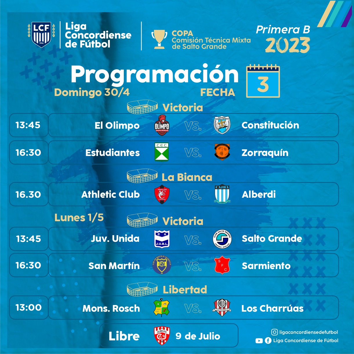 La Liga Concordiense de Fútbol dio a conocer la programación para la tercera fecha de la Primera «B» Copa Comisión Técnica Mixta de Salto Grande. Habrá partidos el domingo y en el feriado del lunes.