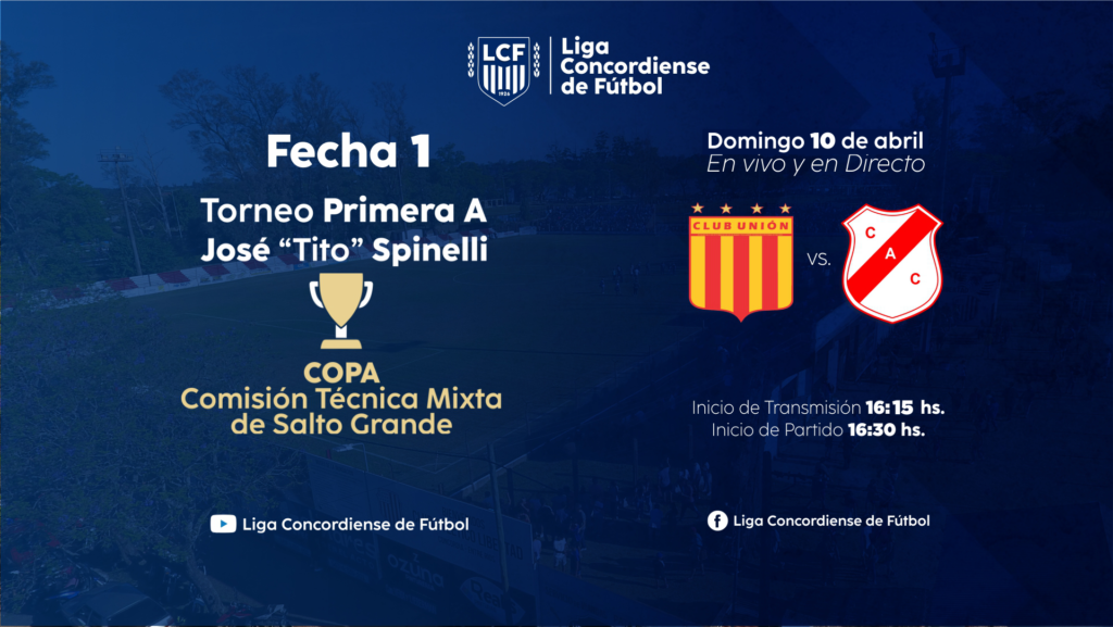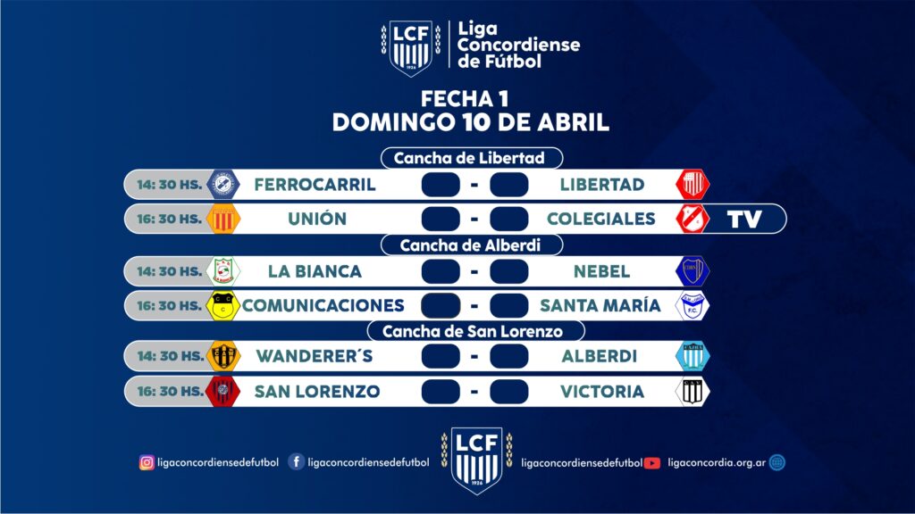 Este domingo 10 de abril comienza el Torneo de Primera División A Jose «Tito» Spinelli, Copa Comisión Técnica Mixta de Salto Grande y desde la mesa directiva de la Liga Concordiense de Fútbol presidida por el Dr. Julio Larrocca compartimos la programación de la jornada inicial