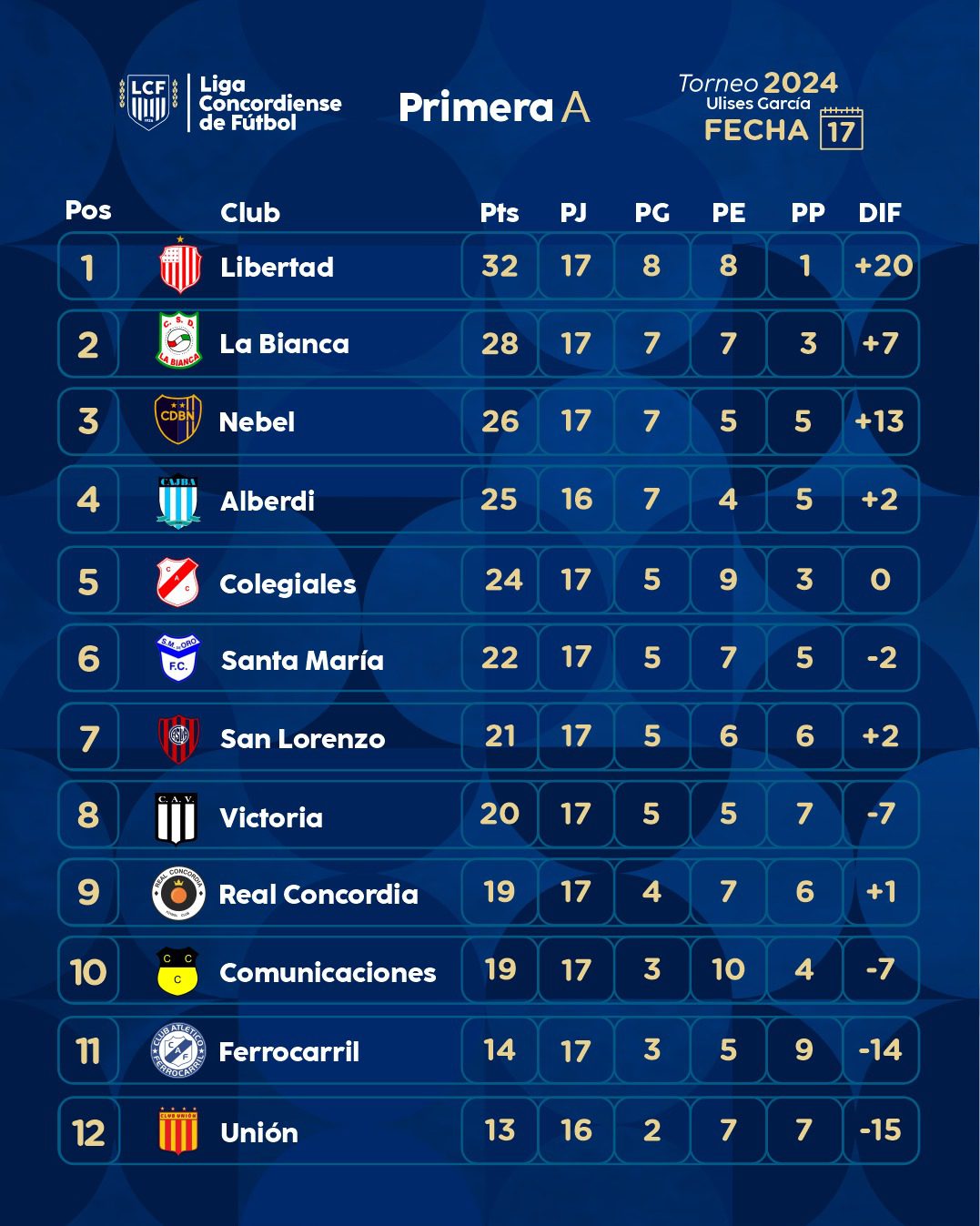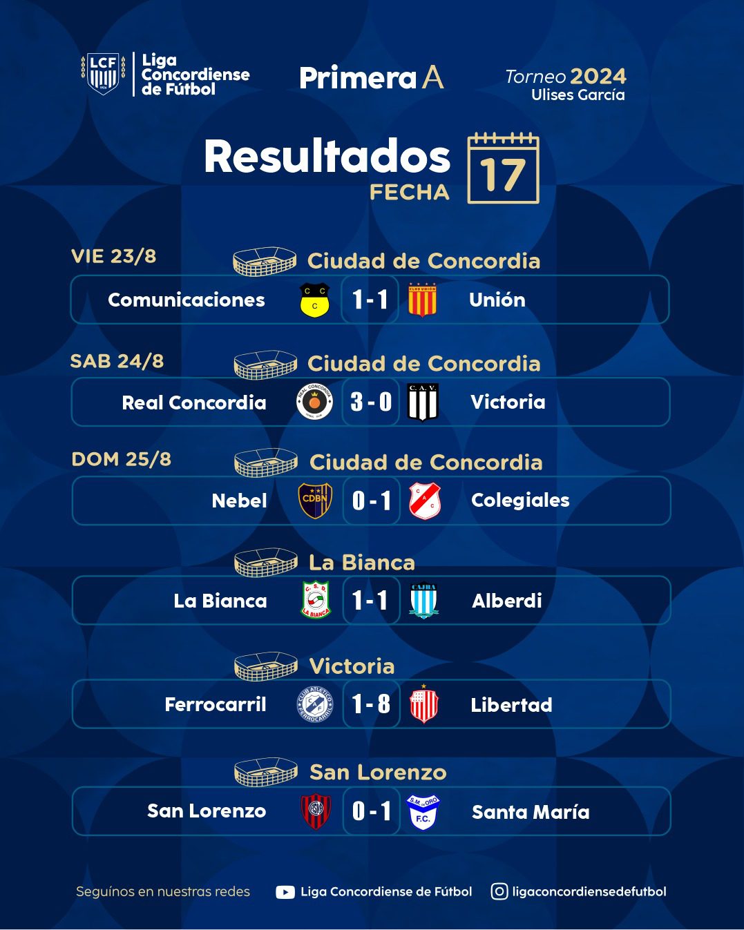 Se jugó la decimoséptima fecha de la Primera «A» Torneo Ulises García. El líder Libertad goleó 8 a 1 a Ferro y le sacó cuatro puntos al escolta La Bianca que igualó 1 a 1 ante Alberdi. Colegiales dio otro batacazo triunfando 1 a 0 ante Defensores de Nebel. Santa María de Oro le ganó 1 a 0 a San Lorenzo. El sábado, Real Concordia venció 3 a 0 a Victoria y el viernes Comunicaciones empató 1 a 1 frente a Unión.