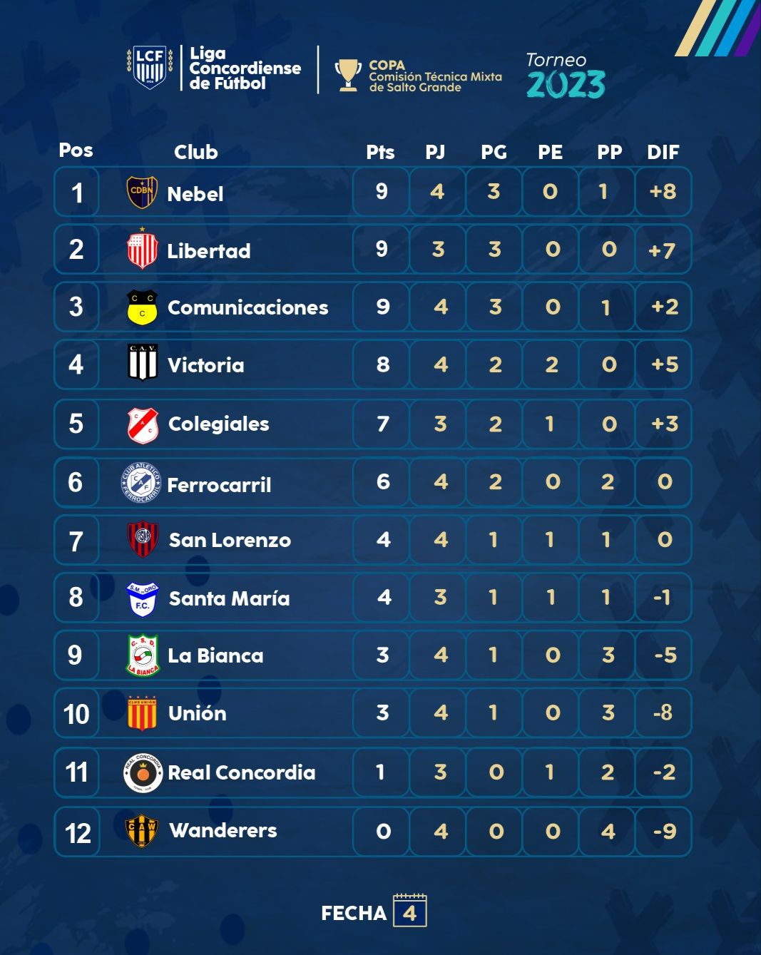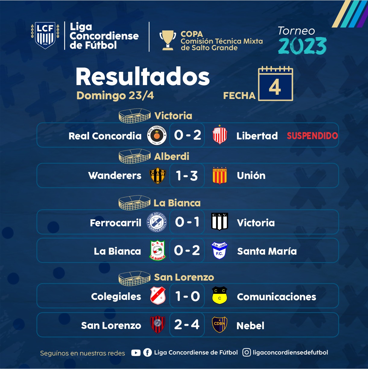 Se jugó la cuarta fecha de la Primera A «Copa Comisión Técnica Mixta de Salto Grande». Libertad le ganaba 2 a 0 a Real cuando el juego debió suspenderse por agresión a uno de los jueces de línea cuando quedaban diez minutos para el término del encuentro. Nébel derrotó 4 a 2 a San Lorenzo y alcanzó momentáneamente en el segundo puesto a Comunicaciones que cayó 1 a 0 ante Colegiales. Victoria conservó el invicto al ganarle 1 a 0 a Ferro. Santa María de Oro consiguió su primera victoria de la temporada al doblegar por 2 a 0 a La Bianca. Por último, en un partido importante de la zona baja, Unión venció 3 a 1 a Wanderer’s y también sumó de a tres por primera vez en esta edición de la Liga.