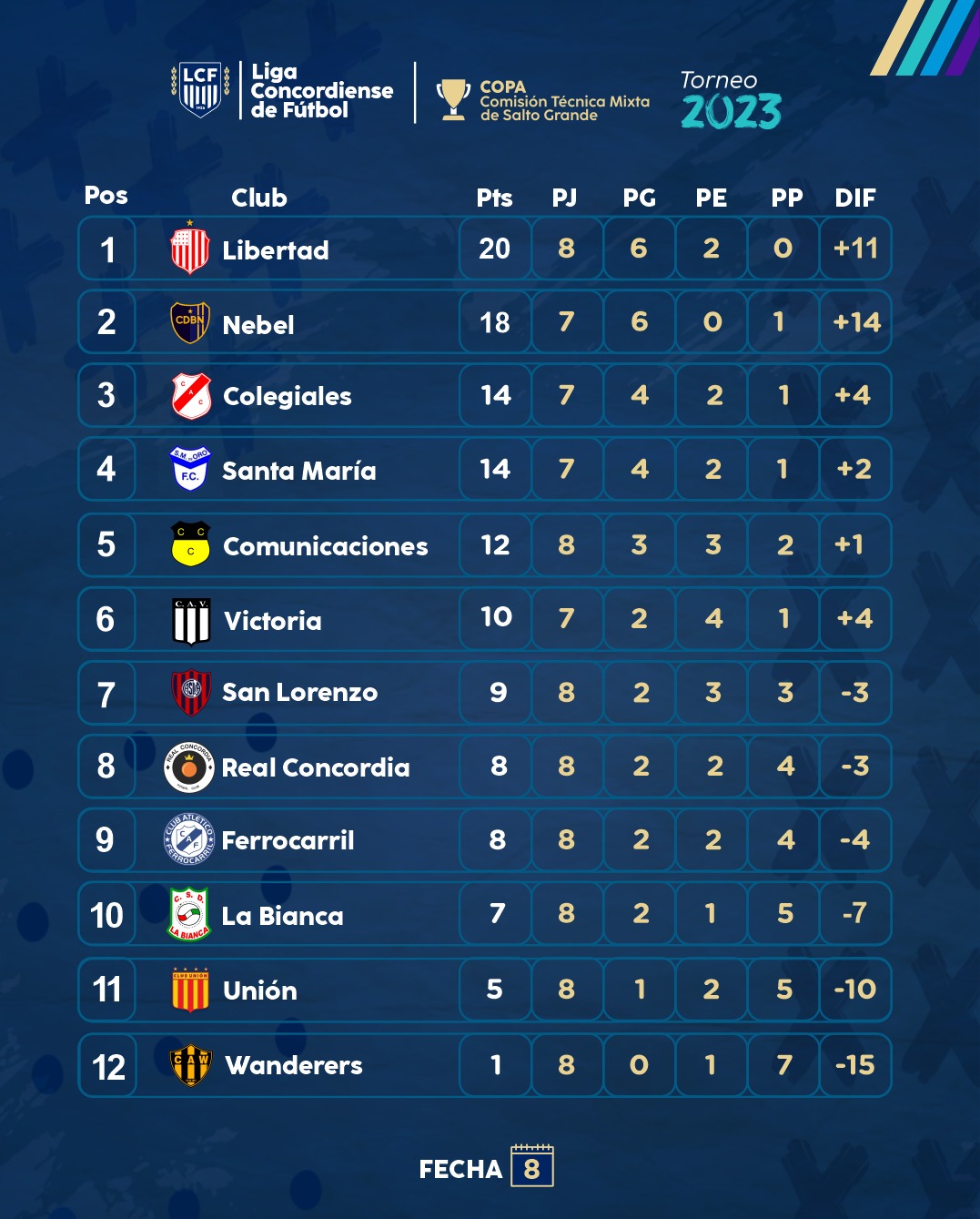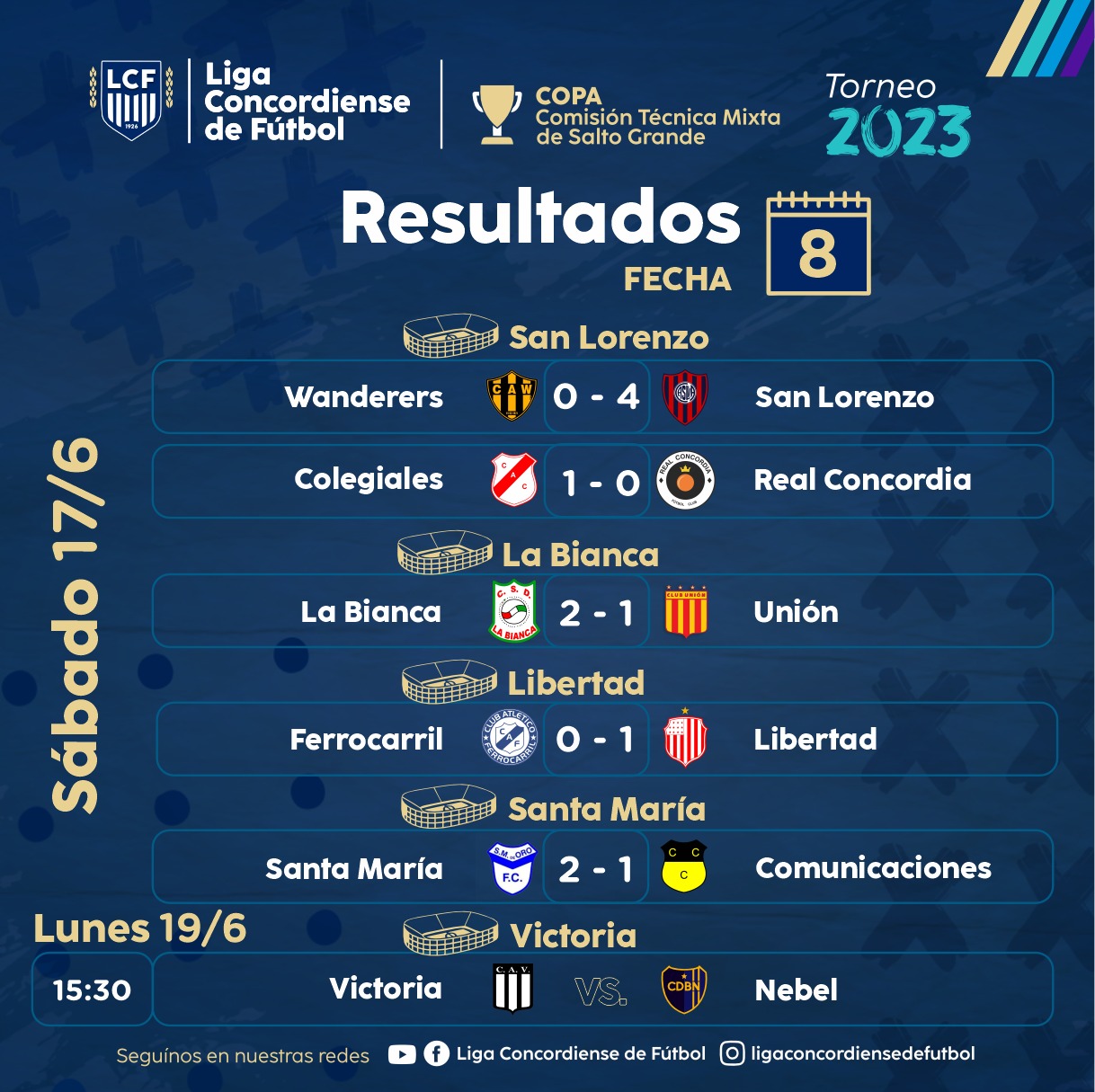 Se jugó parcialmente la octava fecha de la Primera «A» Copa Comisión Técnica Mixta de Salto Grande. Libertad le ganó sobre la hora por 1 a 0 a Ferrocarril y con un partido más, volvió a la punta. Santa María de Oro que venció 2 a 1 a Comunicaciones y Colegiales que se impuso por 1 a 0 a Real Concordia mantienen las chances matemáticas de luchar por el campeonato. San Lorenzo le dio otro cachetazo a Wanderer`s tras derrotarlo claramente por 4 a 0. La Bianca volvió al triunfo al batir por 2 a 1 a Unión. Este octavo capítulo se completará el lunes cuando se enfrenten Victoria y Nebel en el Corralito del Sur.