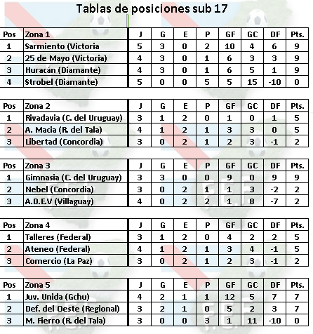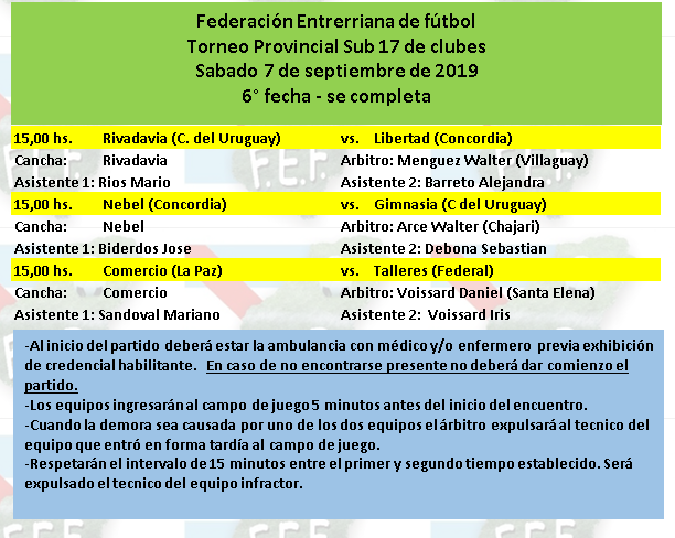 Este sábado se jugará la sexta y última fecha de la fase regular en el Torneo Provincial Sub 17 que organiza la Federación Entrerriana de Fútbol. Por la Zona 3, Defensores de Nébel recibirá en la “ribera” a Gimnasia y Esgrima de Concepción del Uruguay y por la Zona 2, Libertad visitará a Rivadavia en Concepción del Uruguay. Los dos equipos de Concordia buscarán la clasificación a los cuartos de final.