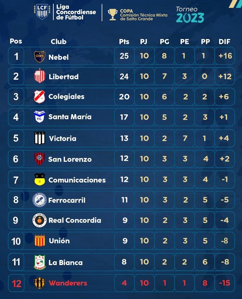 Defensores de Nebel es puntero y le lleva un punto a Libertad. Esto hace que dependa de sí mismo para consagrarse, y un triunfo ante Wanderer´s le hará dar la vuelta olímpica. Por su parte, Libertad deberá esperar que pasa justamente con Nebel, porque se pueden dar resultados que lo hagan ser campeón, o igualar la posición con los de la Ribera. Si el Lobo gana y Nebel empata o pierde será campeón el equipo del Parque Mitre. Si los dos ganan o empatan, el campeón será Nebel. Entonces, nos preparamos para una definición atrapante, como nos ha acostumbrado la Liga en estos últimos años ya que todo se ha definido en la última fecha.
