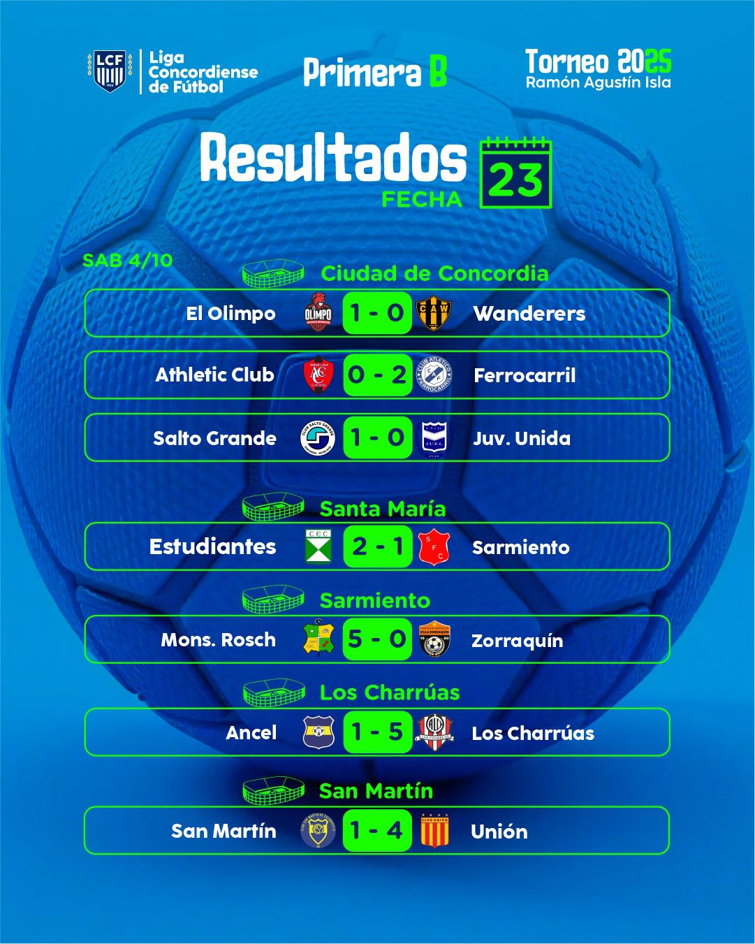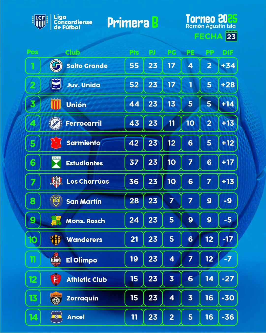 Se jugó la vigesimotercera fecha de la Divisional «B» Ramón Agustín Isla. En un Estadio Ciudad de Concordia que contó con un magnífico marco de público, Salto Grande le ganó 1 a 0 a Juventud Unida y quedó como único líder del certamen con nueve puntos por disputar. En los otros partidos, Unión derrotó 4 a 1 a San Martín, Ferrocarril doblegó 2 a 0 al Athletic Club, Estudiantes venció 2 a 1 a Sarmiento, Atlético Charrúas goleó 5 a 1 a Ancel, Monseñor Rosch hizo lo propio al imponerse 5 a 0 a Villa Zorraquin y El Olimpo batió 1 a 0 a Wanderer´s.