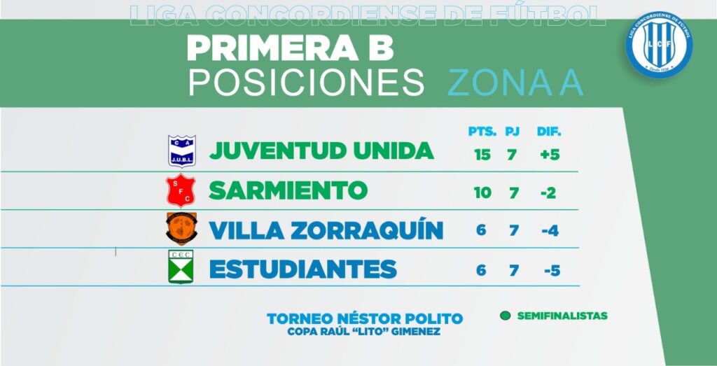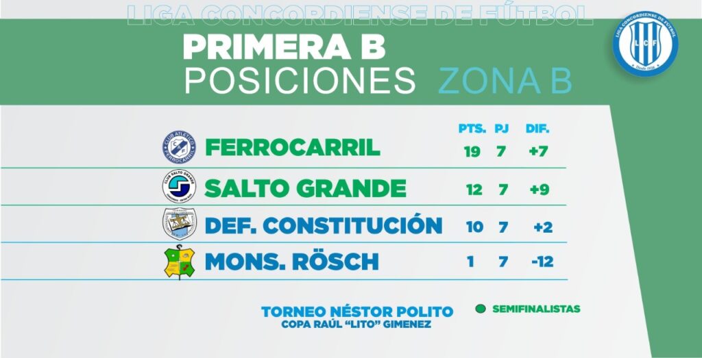 Se jugó este sábado la séptima y última fecha de la ronda inicial en la Divisional “B” Néstor Polito Copa Lito Giménez. En el segundo turno de La Bianca, Salto Grande goleó a Sarmiento 5 a 0 y se clasificó a las semifinales del certamen. Mientras tanto en la cancha de Victoria, Defensores de La Constitución derrotó 6 a 4 a Estudiantes pero no le alcanzó para pasar y se despidió de la competencia. Previamente en la ciudad satélite, Ferro y Juventud Unida conservaron sus invictos porque terminaron 1 a 1 y solo para cumplir con el calendario, Monseñor Rosch empató 1 a 1 con Villa Zorraquín en el Corralito del Sur.