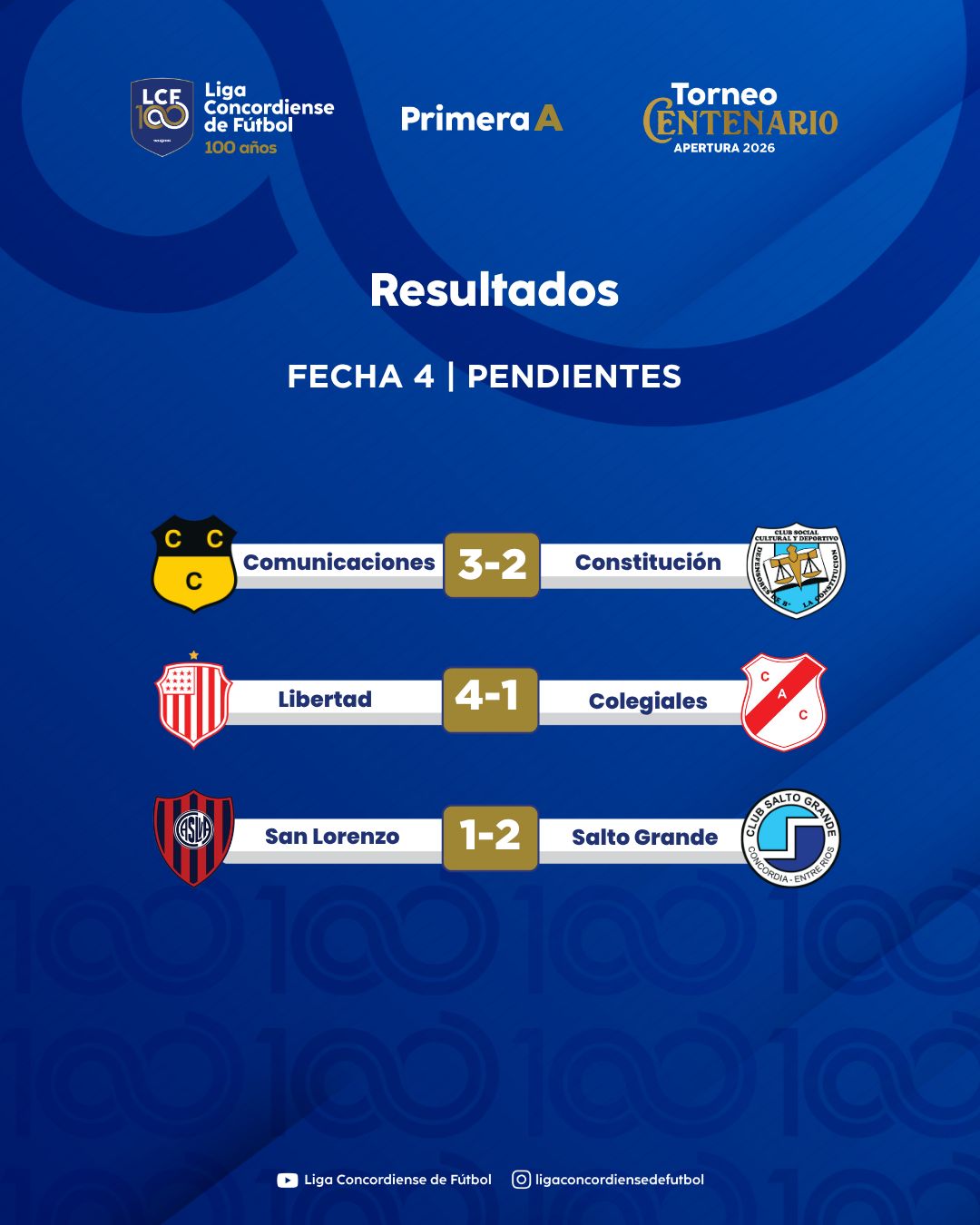 Se jugaron tres encuentros pendientes de la cuarta fecha del Torneo Centenario Apertura. Salto Grande derrotó 2 a 1 a San Lorenzo y llegó a la punta del certamen. Libertad venció 4 a 1 a Colegiales y Comunicaciones le ganó 3 a 2 a Constitución.