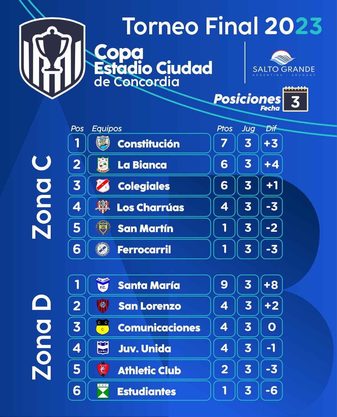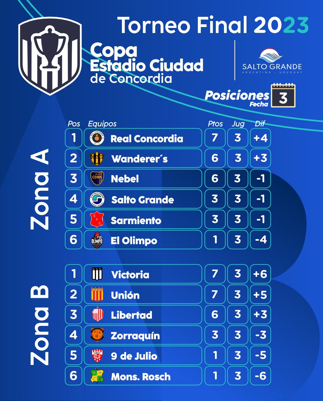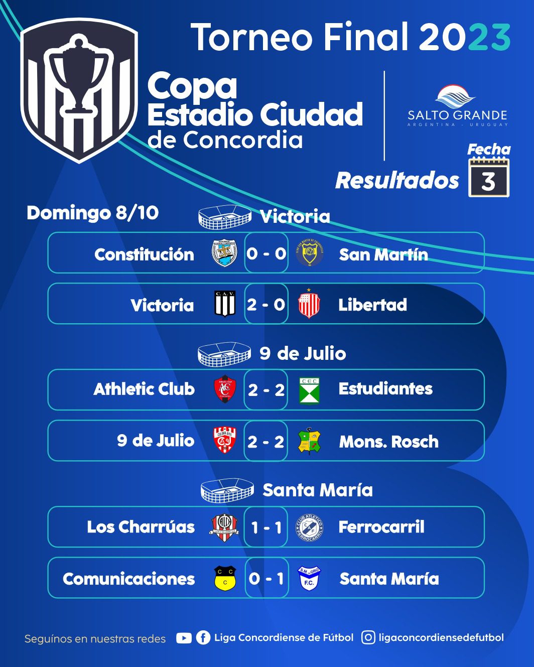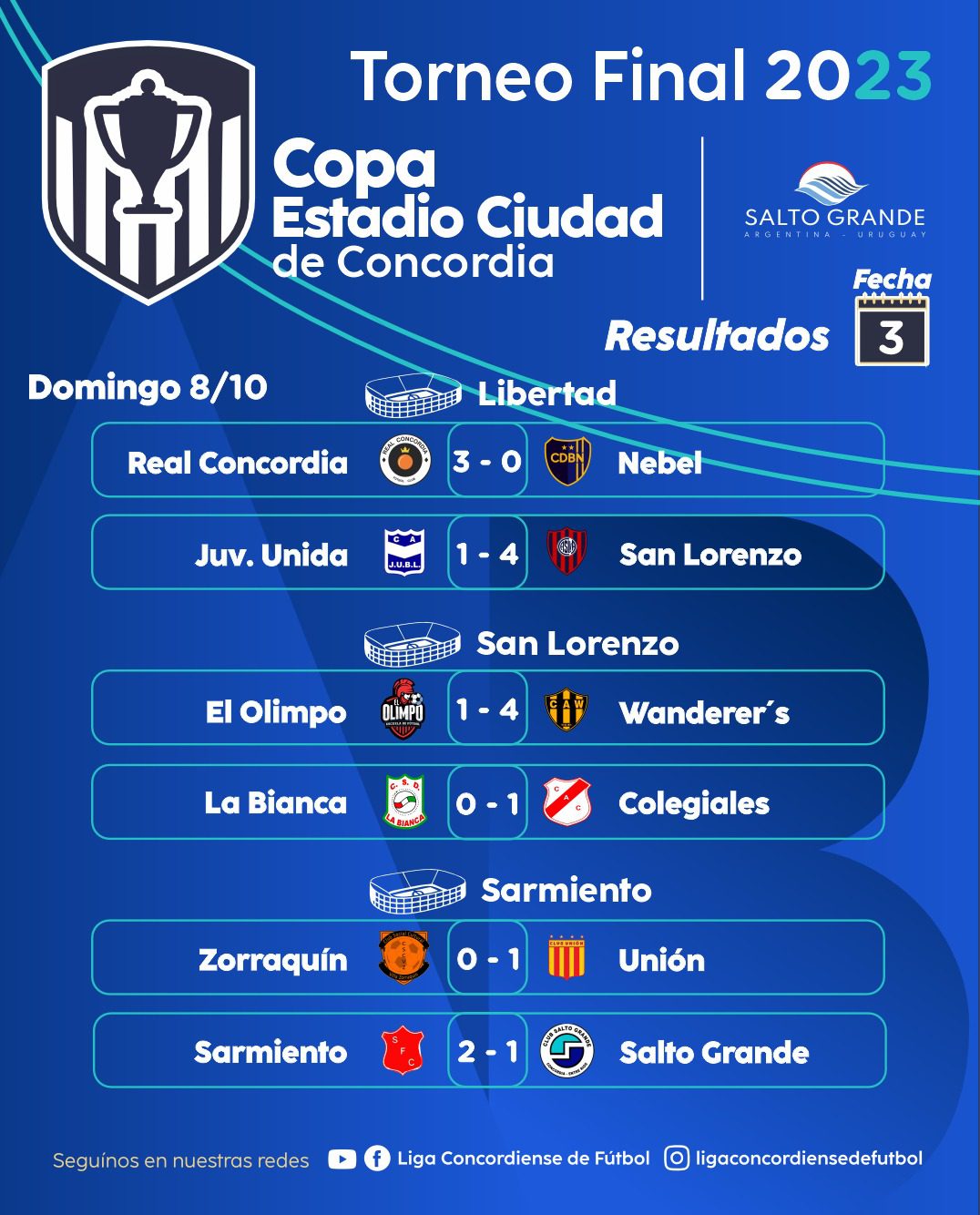 Se jugó la tercera fecha de la Copa «Estadio Ciudad de Concordia». Santa María de Oro venció con lo justo a Comunicaciones y es el único equipo que ganó en todas sus presentaciones. Victoria dejó sin invicto a Libertad al derrotarlo como local. Real Concordia sorprendió y bajó a Nebel. El clásico fue para San Lorenzo que lo dio vuelta y se impuso ante Juventud Unida. Wanderer´s, Unión y Colegiales también celebraron en esta jornada.