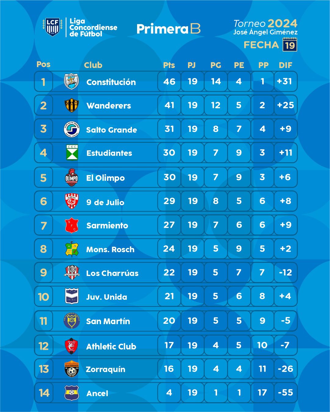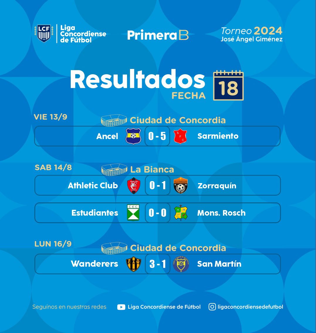 El sábado se disputaron los encuentros pendientes de la decimoctava fecha de la Primera B José Ángel Giménez. Wanderer’s volvió a quedar a cinco puntos de Constitución al derrotar 3 a 1 a San Martín. Sarmiento goleó 5 a 0 a Ancel, Estudiantes y Monseñor Rösch igualaron 0 a 0 y Zorraquín le ganó 1 a 0 a Athletic Club.