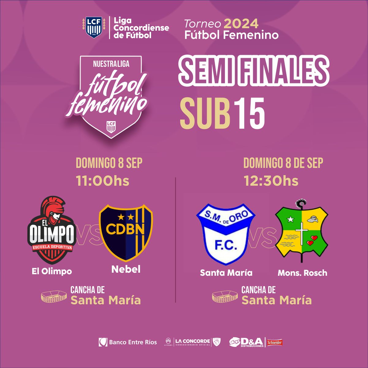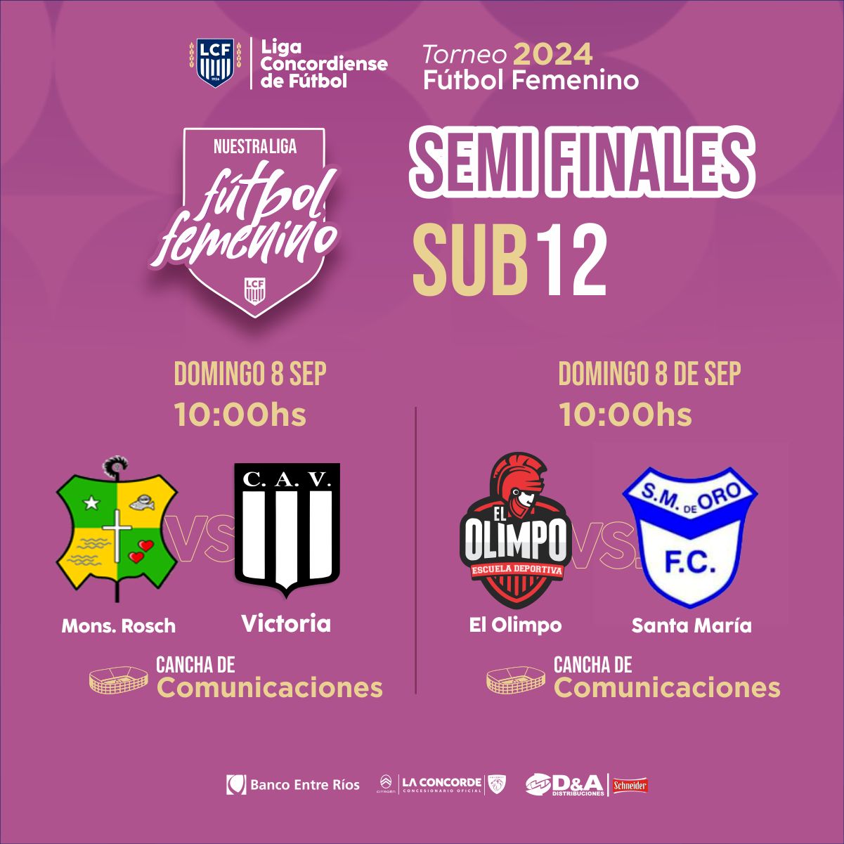 Este sábado en el Estadio Ciudad de Concordia se disputarán las semifinales del Fútbol Femenino. A las 13.30, Constitución enfrentará a Monseñor Rösch y a las 15.30 Santa María de Oro se medirá con Estudiantes. Por su parte el domingo se disputarán las semis en Sub 12 y Sub 15 en Comunicaciones y en el Justo Gamboa respectivamente.