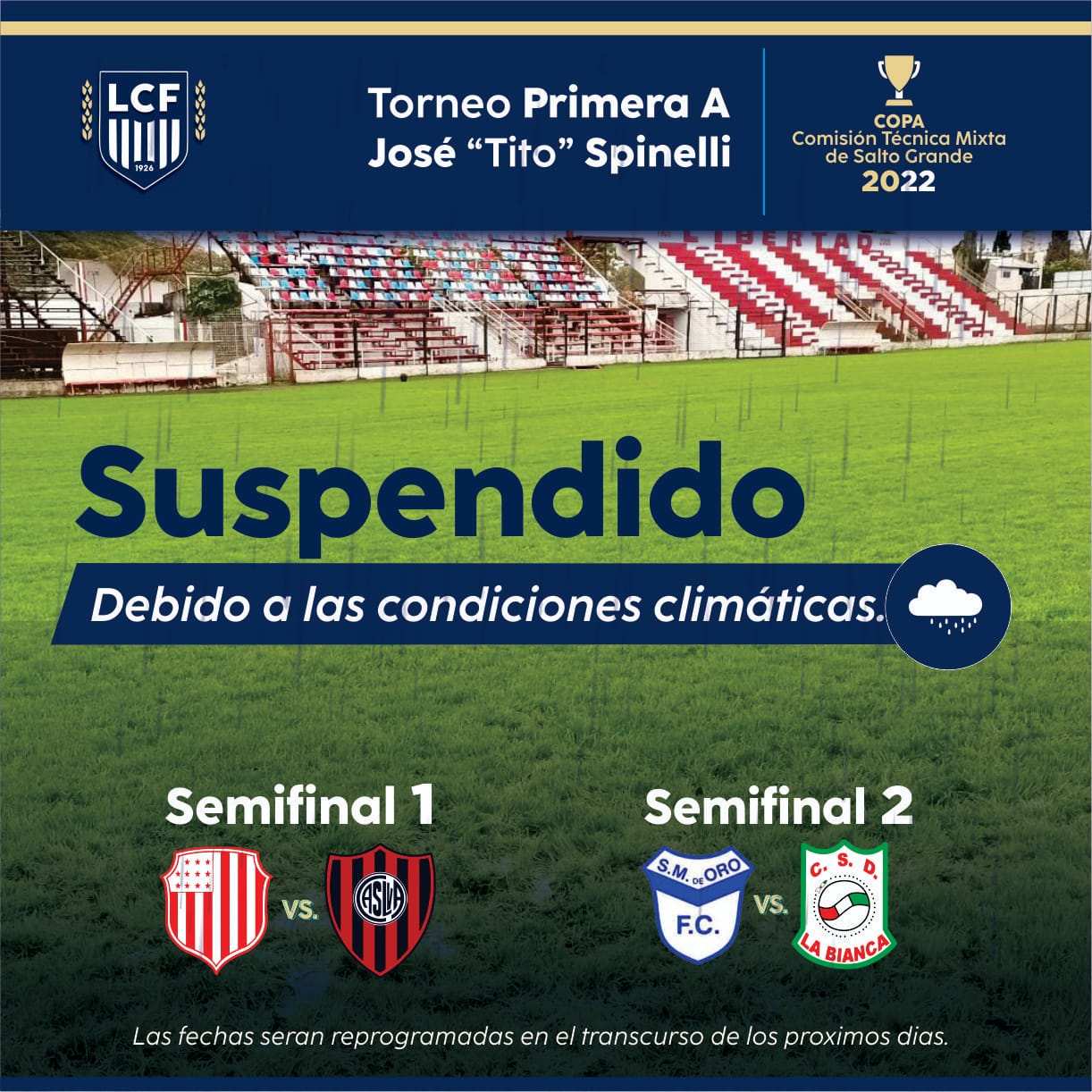 Con motivo de las precipitaciones caídas en las últimas horas, las que se extenderán en el transcurso del día, según Servicio Meteorológico Nacional, haciendo inviable el normal y buen estado del campo de juego del Club Atlético Libertad donde estaban programadas las semifinales del torneo de la división A de la LCF, para este fin de semana, esta Liga suspende las mismas, las que seran reprogramadas en el transcurso de las próximos días.