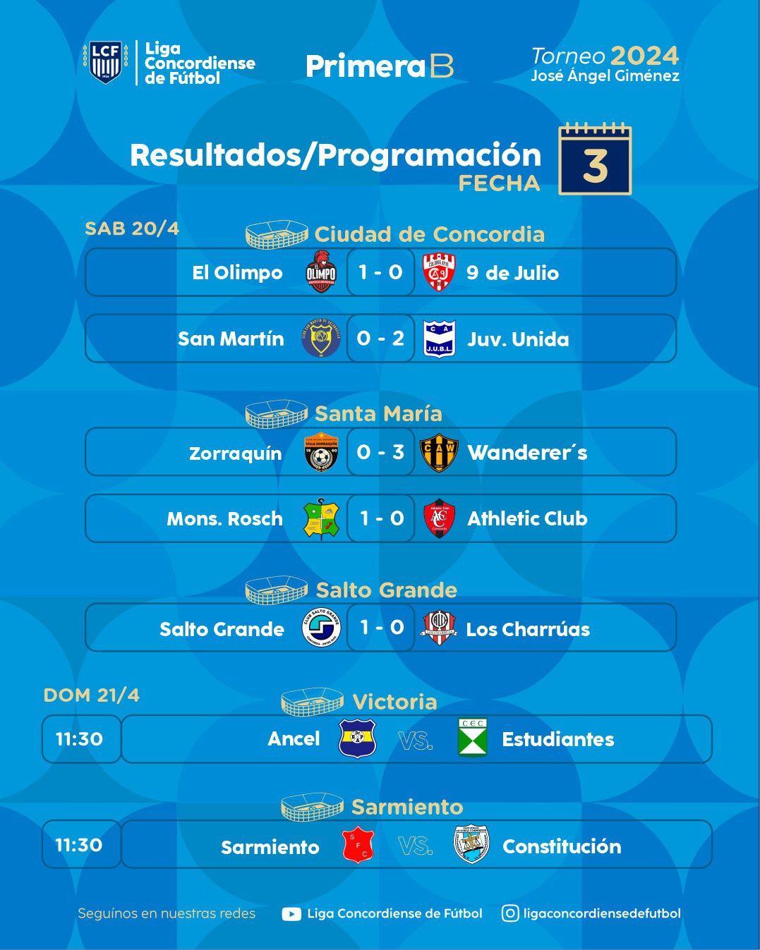 Se jugaron cinco encuentros correspondientes a la 3° Fecha de la Primera B José Ángel Giménez. En el Estadio Ciudad de Concordia, El Olimpo venció 1 a 0 sobre la hora a 9 de Julio y Juventud Unida doblegó 2 a 0 a San Martín de Calabacilla. En el Justo Gamboa, Wanderer’s derrotó 3 a 0 a Villa Zorraquín y Monseñor Rösch le ganó 1 a 0 a Athletic Club. Por último, Salto Grande se impuso 1 a 0 como local ante Atlético Los Charrúas.
